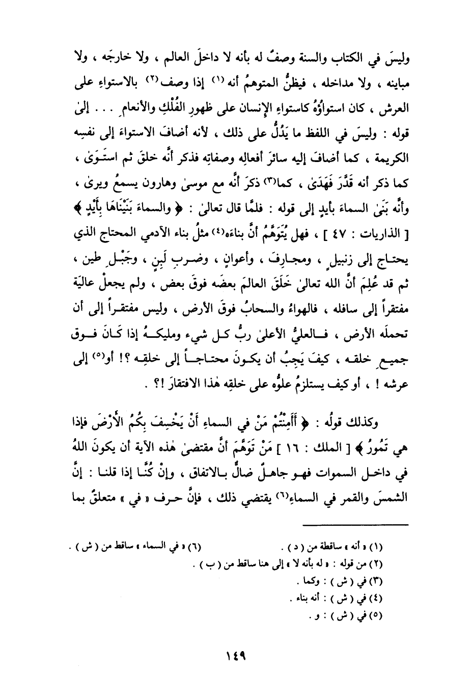 وليس في الكتاب والسنة وصفٌ له بأنه لا داخل العالم، ولا خارجه، ولا مباينه، ولا مداخله، فيظنُّ المتوهم أنه (¬1) إذا وصف (¬2) بالاستواء على العرش، كان استواؤُهُ كاستواء الإنسان على ظهور الفُلكِ والأنعام ... إلى قوله: وليس في اللفظ ما يدل على ذلك، لأنه أضاف الاستواء إلى نفسه الكريمة، كما أضاف إليه سائر أفعاله وصفاته فذكر أنه خلق ثم استوى، كما ذكر أنه قدَّر فَهَدَى، كما (¬3) ذكر أنه مع موسى وهارون يسمع ويرى، وأنَّه بَنى السماء بأيدٍ إلى قوله: فلمَّا قال تعالى: {والسماءَ بَنَيْنَاهَا بِأيْدٍ} [الذاريات: 47}، فهل يُتوهَّمُ أنَّ بناءه (¬4) مثلُ بناء الآدمي المحتاج الذي يحتاج إلى زنبيلٍ، ومجارِفَ، وأعوانٍ، وضرب لبنٍ، وجبلِ طين، ثم قد عُلِمَ أن الله تعالى خلق العالم بعضه فوق بعض، ولم يجعل عالية مفتقراً إلى سافله، فالهواء والسحاب فوق الأرض، وليس مفتقراً إلى أن تحمله الأرض، فالعليُّ الأعلى ربُّ كل شيء ومليكه إذا كان فوق جميع خلقه، كيف يجب أن يكون محتاجاً إلى خلقه؟! أو (¬5) إلى عرشه!، أو كيف يستلزم علوُّه على خلقه هذا الافتقارَ!؟.