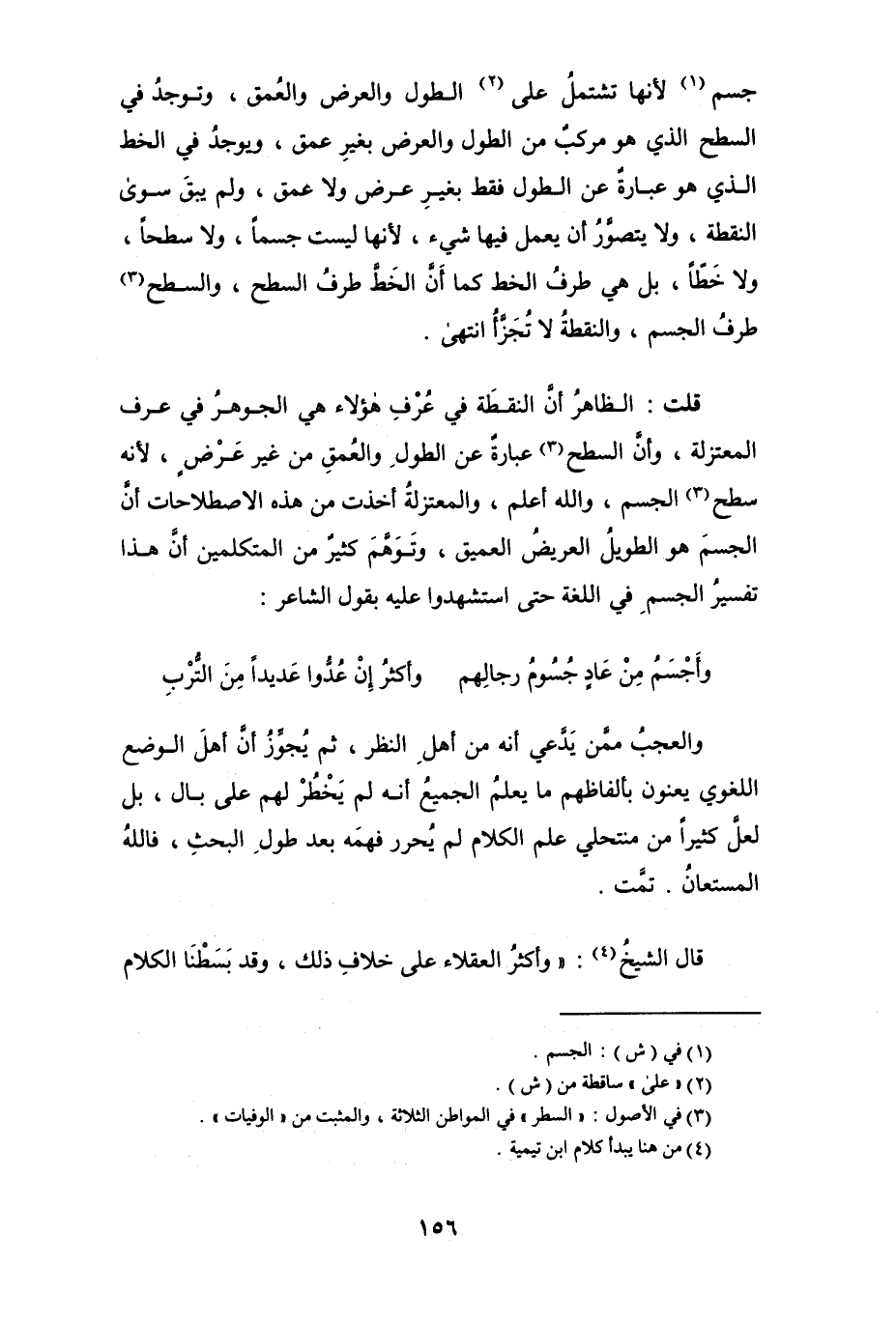 قلت: الظاهرُ أنَّ النقطة في عُرفِ هؤلاء هي الجوهر في عرف المعتزلة، وأنَّ السطح (3) عبارةٌ عن الطول والعمق من غير عرضٍ، لأنه سطح (3) الجسم، والله أعلم، والمعتزلة أخذت من هذه الاصطلاحات أنَّ الجسم هو الطويل العريضُ العميق، وتوهَّم كثير من المتكلمين أن هذا تفسير الجسم في اللغة حتى استشهدوا عليه بقول الشاعر: