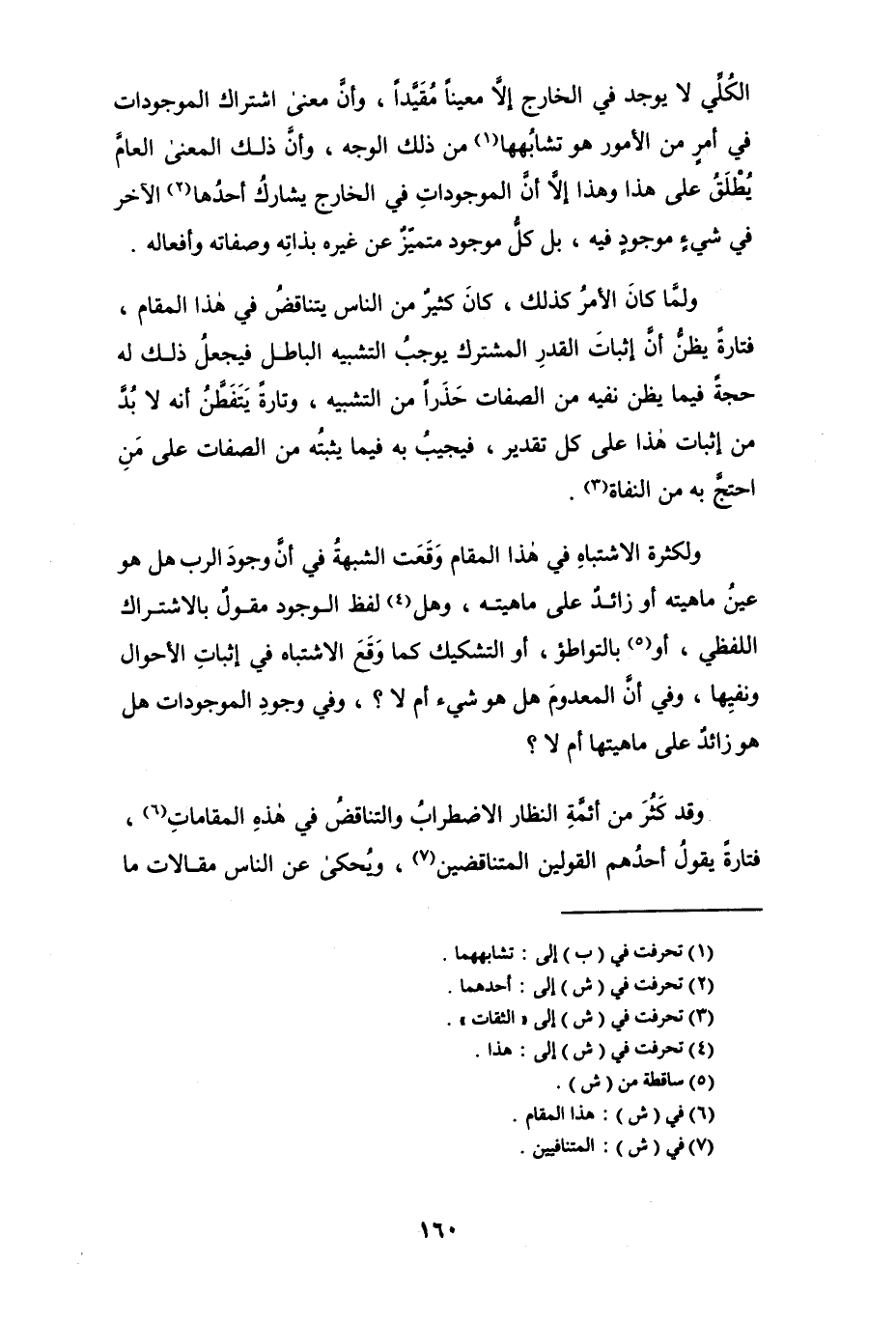 ولكثرة الاشتباه في هذا المقام وقعت الشبهة في أن وجود الرب هل هو عين ماهيته أو زائدٌ على ماهيته، وهل (¬4) لفظ الوجود مقول بالاشتراك اللفظي، أو (¬5) بالتواطؤ، أو التشكيك كما وقع الاشتباه في إثبات الأحوال ونفيها، وفي أن المعدوم هل هو شيء أم لا؟، وفي وجود الموجودات هل هو زائدٌ على ماهيتها أم لا؟