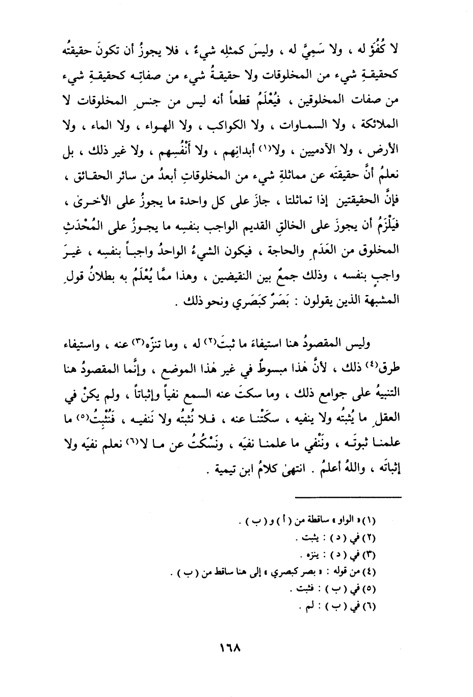 وليس المقصود هنا استيفاء ما ثبت (¬2) له، وما تنزّه (¬3) عنه، واستيفاء طرق (¬4) ذلك، لأنَّ هذا مبسوطٌ في غير هذا الموضع، وإنما المقصود هنا التنبيه على جوامع ذلك، وما سكت عنه السمع نفياً وإثباتاً، ولم يكن في العقل ما يُثبتُه ولا ينفيه، سكتنا عنه، فلا نثبته ولا ننفيه، فنثبت (¬5) ما علمنا ثبوته، وننفي ما علمنا نفيه، ونسكُتُ عن ما لا (¬6) نعلم نفيه ولا إثباته، والله أعلم. انتهى كلام ابن تيمية.