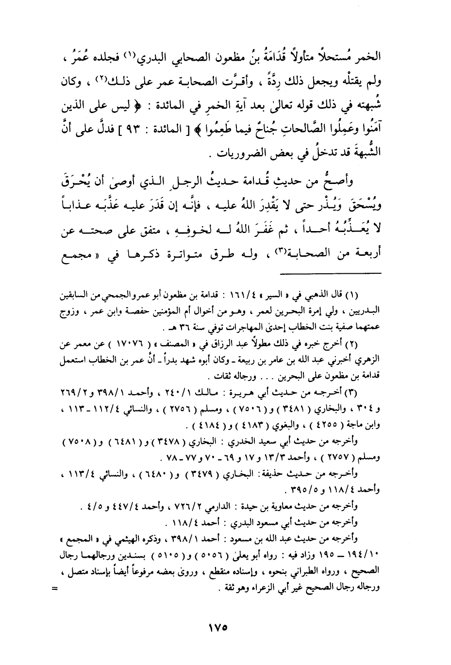 الخمر مُستحلاً متأولاً قُدامة بن مظعون الصحابي البدري (¬1) فجلده عمر، ولم يقتله ويجعل ذلك رِدّةً، وأقرت الصحابة عمر على ذلك (¬2)، وكان شبهته في ذلك قوله تعالى بعد آية الخمر في المائدة: {ليس على الذين آمنوا وعملوا الصالحات جُناحٌ فيما طَعِمُوا} [المائدة: 93] فدلَّ على أنَّ الشُّبهة قد تدخلُ في بعض الضروريات.