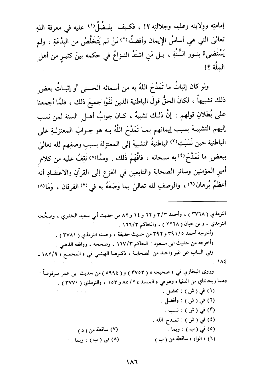 ولو كان إثباتُ ما تمدَّح الله به من أسمائه الحسنى أو إثبات بعض ذلك تشبيهاً، لكان الحق قول الباطنية الذين نَفَوْا جميع ذلك، فلمَّا أجمعنا على بُطلان قولهم: إن ذلك تشبيهٌ، كان جواب أهل السنة لمن نسب إليهم التشبيه بسبب إيمانهم بما تمدَّح الله به هو جواب المعتزلة على الباطنية حين نَسَبَتِ (¬3) الباطنيةُ التشبيه إلى المعتزلة بسبب وصفهم لله تعالى ببعض ما تمدَّح (¬4) به سبحانه، فافهم ذلك. ومما (¬5) تقف عليه من كلام أمير المؤمنين وسائر الصحابة والتابعين في الفزع إلى القرآن والاعتقاد أنه أعظم برهان (¬6)، والوصف لله تعالى بما وصفه به في (¬7) الفرقان، وما (¬8)