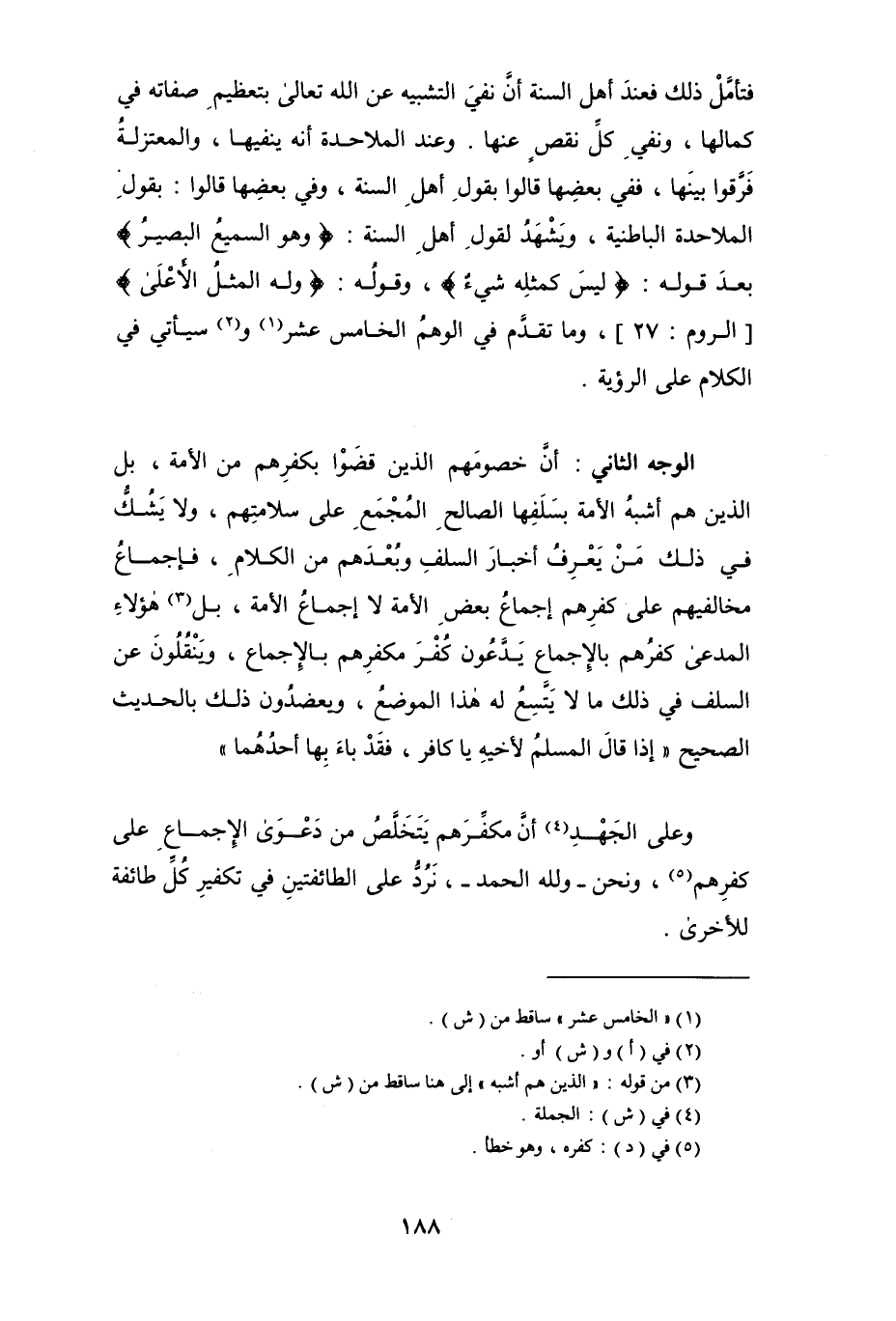 الوجه الثاني: أنَّ خصومهم الذين قضَوْا بكفرِهم من الأمة، بل الذين هم أشبهُ الأمة بسَلَفِها الصالح المُجْمَعِ على سلامتهم، ولا يشُكُّ في ذلك من يعرفُ أخبار السلف وبُعدَهم من الكلام، فإجماع مخالفيهم على كفرهم إجماعُ بعضِ الأمة لا إجماع الأمة، بل (¬3) هؤلاء المدعى كفرُهم بالإجماع يدَّعُون كُفْرَ مكفرِهم بالإجماع، وينقُلُون عن السلف في ذلك ما لا يتَّسِعُ له هذا الموضع، ويعضدُون ذلك بالحديث الصحيح " إذا قالَ المسلمُ لأخيهِ يا كافر، فقَدْ باء بها أحدُهُما ".