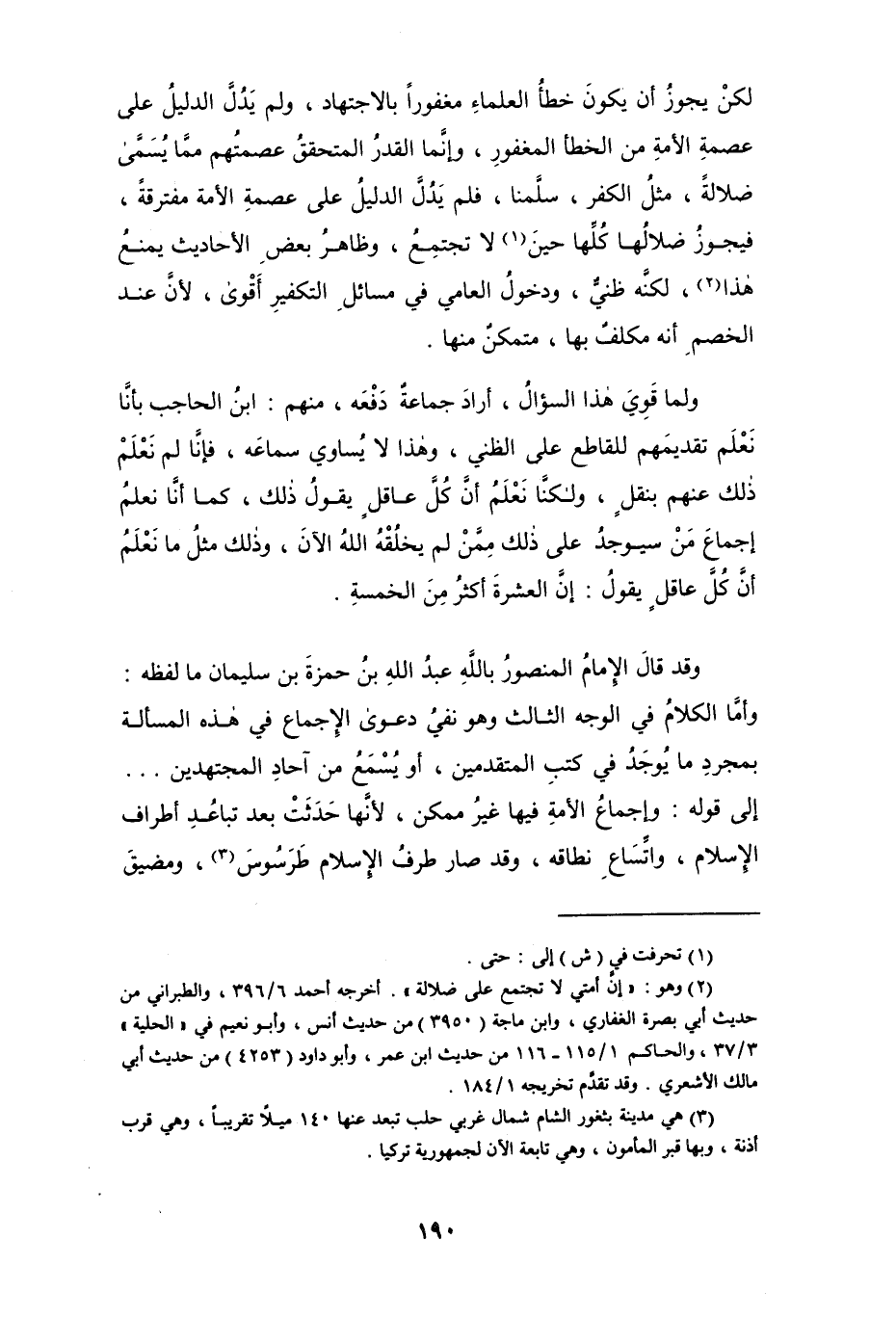 وقد قال الإمام المنصور بالله عبد الله بن حمزة بن سليمان ما لفظه: وأما الكلام في الوجه الثالث وهو نفي دعوى الإجماع في هذه المسألة بمجرد ما يوجد في كتب المتقدمين، أو يُسمعُ من آحاد المجتهدين ... إلى قوله: وإجماع الأمة فيها غيرُ ممكن، لأنها حَدَثَتْ بعد تباعُدِ أطراف الإسلام، واتِّساع نطاقه، وقد صار طرفُ الإسلام طَرَسُوسَ (¬3)، ومضيق