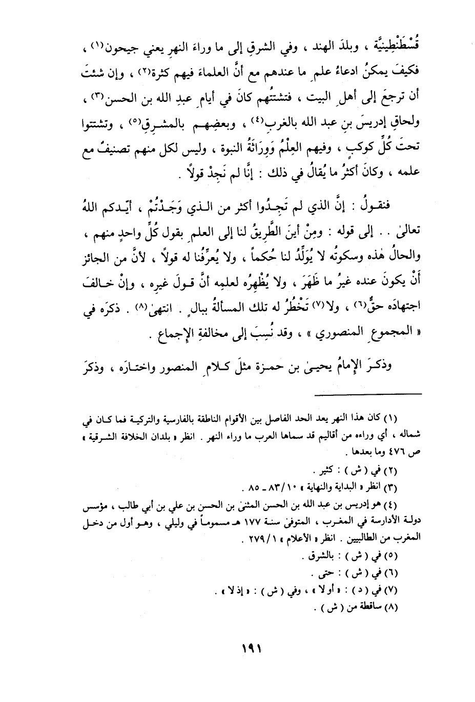 قُسطنطينيَّة، وبلد الهند، وفي الشرقِ إلى ما وراء النهر يعني جيحون (¬1)، فكيف يمكنُ ادعاءُ علمِ ما عندهم مع أنَّ العلماء فيهم كثرة (¬2)، وإن شئت أن ترجع إلى أهل البيت، فتشتتُهم كان في أيام عبد الله بن الحسن (¬3)، ولحاق إدريس بن عبد الله بالغرب (¬4)، وبعضهم بالمشرق (¬5)، وتشتتوا تحتَ كُلِّ كوكبٍ، وفيهم العِلمُ ووراثة النبوة، وليس لكل منهم تصنيفٌ مع علمه، وكان أكثرُ ما يُقالُ في ذلك: إنَّا لم نَجِدْ قولاً.