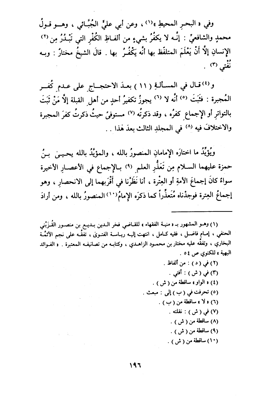 و (¬4) قال في المسألة (11) بعد الاحتجاج على عدمِ كُفر المُجبرة: فثبت (¬5) أنَّه لا (¬6) يجوزُ تكفيرُ أحدٍ من أهل القبلة إلاَّ من ثَبَتَ بالتواتر أو الإجماع كفرُه، وقد ذكرتُه (¬7) مستوفىً حيث ذكرتُ كفر المجبرة والاختلاف فيه (¬8) في المجلد الثالث بعد هذا ..