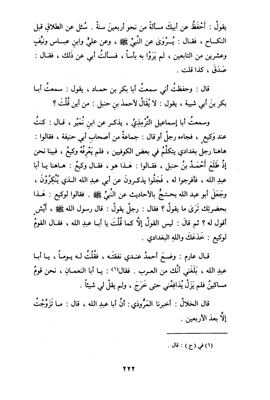 قال الخلالُ: أخبرنا المَرُّوذي: أنَّ أبا عبد الله، قال: ما تَزَوَّجْتُ إلاَّ بعدَ الأربعين.