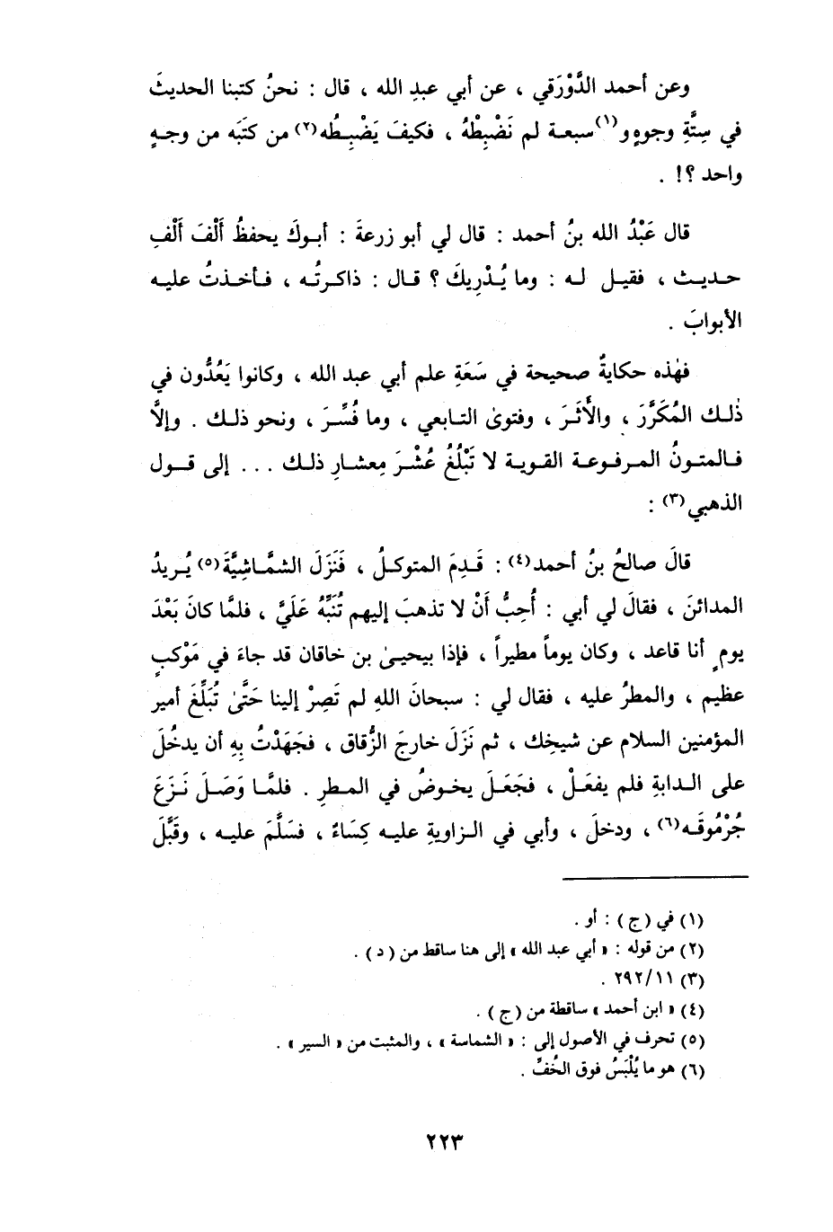 فهذه حكايةٌ صحيحة في سَعَةِ علم أبي عبد الله، وكانوا يعُدُّون في ذلك المُكَرَّر، والأثر، وفتوى التابعي، وما فُسِّر، ونحو ذلك. وإلاَّ فالمتونُ المرفوعة القوية لا تبلُغُ عُشْرَ مِعشارِ ذلك ... إلى قول الذهبي (¬3):