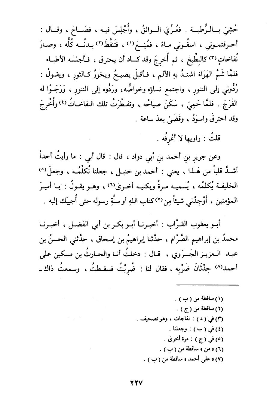 وعن جرير بن أحمد بن أبي دواد، قال: قال أبي: ما رأيتُ أحداً أشدَّ قلباً من هذا، يعني: أحمد بن حنبل، جعلنا نكلمه، وجعل (¬5) الخليفة يكلمه، يسميه مرة ويكنيه أخرى (¬6)، وهو يقول: يا أمير المؤمنين، أوجدني شيئاً من (¬7) كتاب الله أو سنة رسوله حتى أُجيبَك إليه.