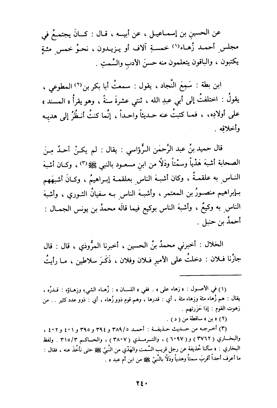 قال حميد بن عبد الرحمن الرُّؤاسي: يقال: لم يكن أحدٌ من الصحابة أشبه هدياً وسمتاً ودلاً من ابن مسعود بالنبي - صلى الله عليه وسلم - (¬3)، وكان أشبه الناس به علقمة، وكان أشبه الناس بعلقمة إبراهيم، وكان أشبههم بإبراهيم منصور بن المعتمر، وأشبه الناس به سفيان الثوري، وأشبه الناس به وكيع، وأشبه الناس بوكيع فيما قاله محمد بن يونس الجمال: أحمد بن حنبل.
