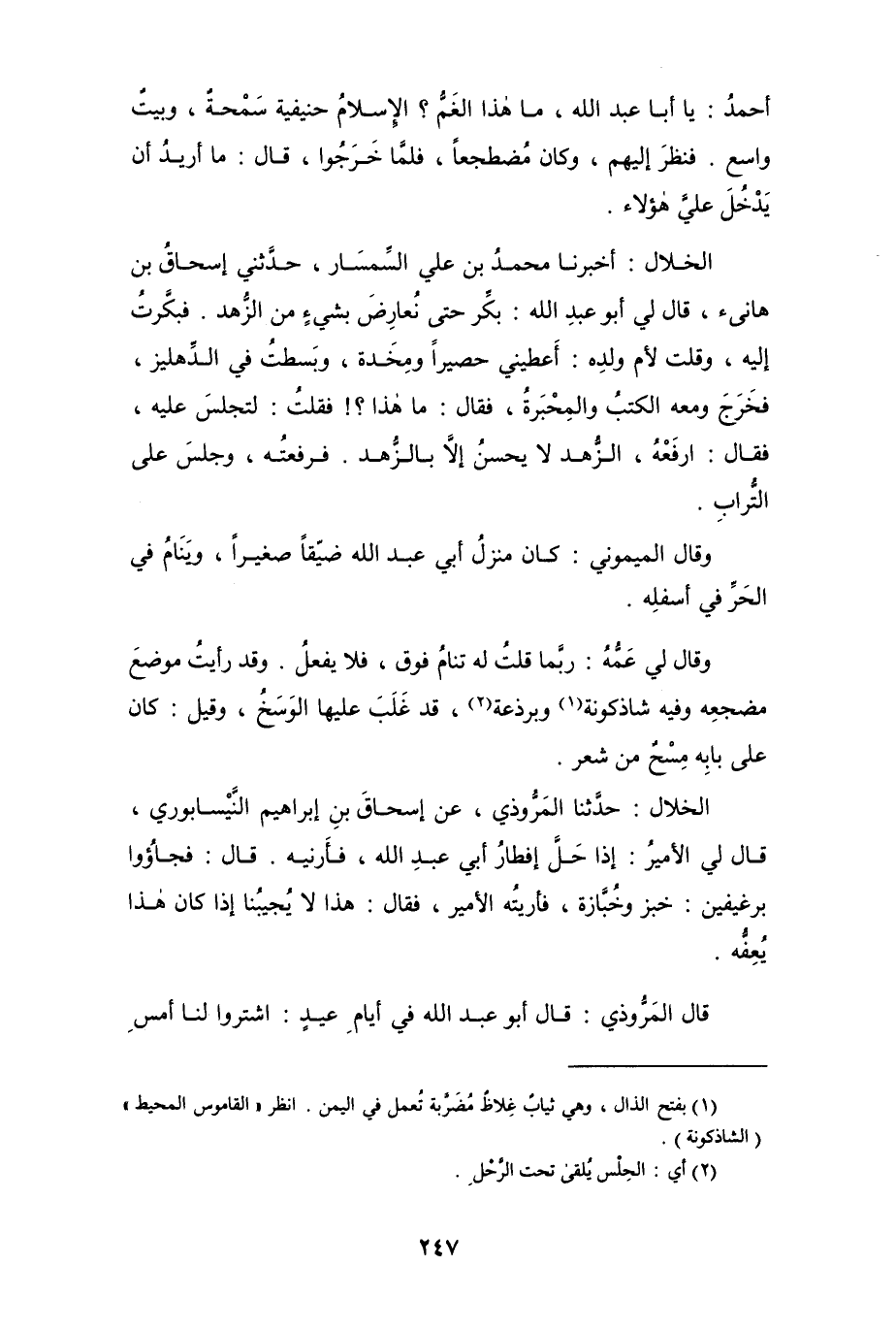 الخلال: أخبرنا محمد بن علي السِّمسَار، حدَّثني إسحاق بن هانىء، قال لي أبو عبد الله: بكِّر حتى نُعارِضَ بشيءٍ من الزُّهد. فبكَّرتُ إليه، وقلت لأم ولده: أعطيني حصيراً ومِخَدة، وبسطتُ في الدِّهليز، فخرج ومعه الكتب والمِحْبَرة، فقال: ما هذا؟! فقلت: لتجلس عليه، فقال: ارفعه، الزهد لا يحسن إلاَّ بالزهد. فرفعته، وجلس على التراب.