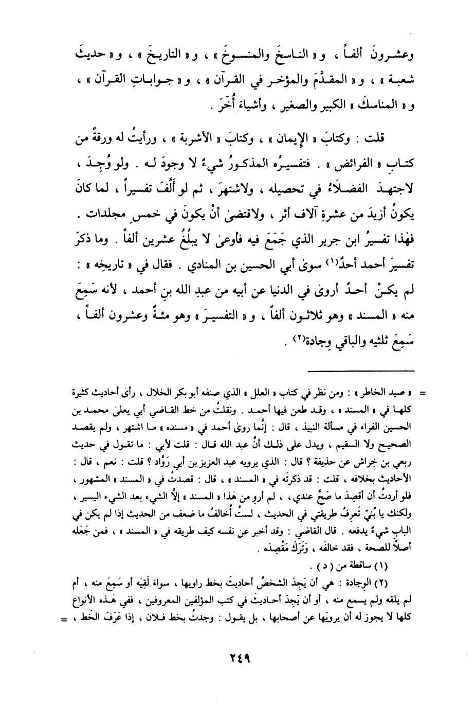 فهذا تفسير ابن جرير الذي جَمَعَ فيه فأوعى لا يبلُغُ عشرين ألفاً. وما ذكر تفسير أحمد أحدٌ (¬1) سوى أبي الحسين بن المنادي. فقال في " تاريخه ": لم يكن أحدٌ أروى في الدنيا عن أبيه من عبد الله بن أحمد، لأنه سَمِعَ منه " المسند " وهو ثلاثون ألفاً، و" التفسير " وهو مئةٌ وعشرون ألفاً، سَمِعَ ثلثيه والباقي وِجادة (¬2).