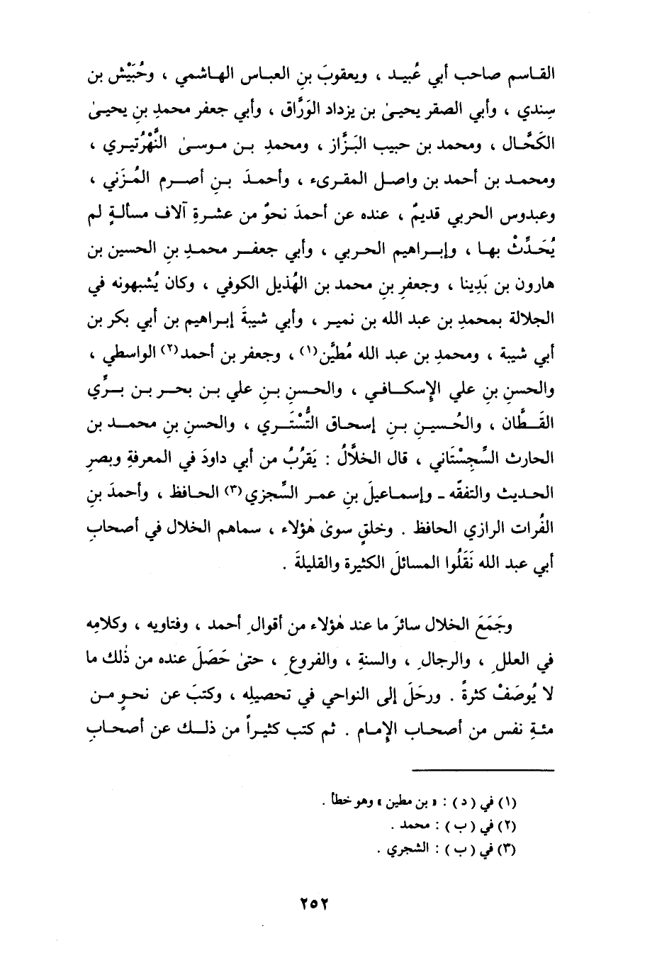 القاسم صاحب أبي عُبيد، ويعقوبَ بنِ العباس الهاشمي، وحُبَيْش بن سِندي، وأبي الصقر يحيى بن يزداد الورَّاق، وأبي جعفر محمدِ بن يحيى الكَحَّال، ومحمد بن حبيب البَرَّاز، ومحمد بن موسى النَّهْرُتيري، ومحمد بن أحمد بن واصل المقرىء، وأحمد بن أصرم المُزَني، وعبدوس الحربي قديمٌ، عنده عن أحمد نحوٌ من عشرة آلاف مسألةٍ لم يُحَدِّث بها، وإبراهيم الحربي، وأبي جعفر محمد بن الحسين بن هارون بن بَدِينا، وجعفر بن محمد بن الهُذيل الكوفي، وكان يُشبهونه في الجلالة بمحمد بن عبد الله بن نمير، وأبي شيبة إبراهيم بن أبي بكر بن أبي شيبة، ومحمد بن عبد الله مُطيَّن (¬1)، وجعفر بن أحمد (¬2) الواسطي، والحسن بن علي الإسكافي، والحسن بن علي بن بحر بن برِّي القطَّان، والحُسين بن إسحاق التُّسْتَري، والحسن بن محمد بن الحارث السِّجِسْتَاني، قال الخلاَّلُ: يقرُبُ من أبي داود في المعرفة وبصر الحديث والتفقه - وإسماعيل بن عمر السِّجزي (¬3) الحافظ، وأحمد بن الفُرات الرازي الحافظ. وخلقٍ سوى هؤلاء، سماهم الخلال في أصحاب أبي عبد الله نَقَلُوا المسائل الكثيرة والقليلة.