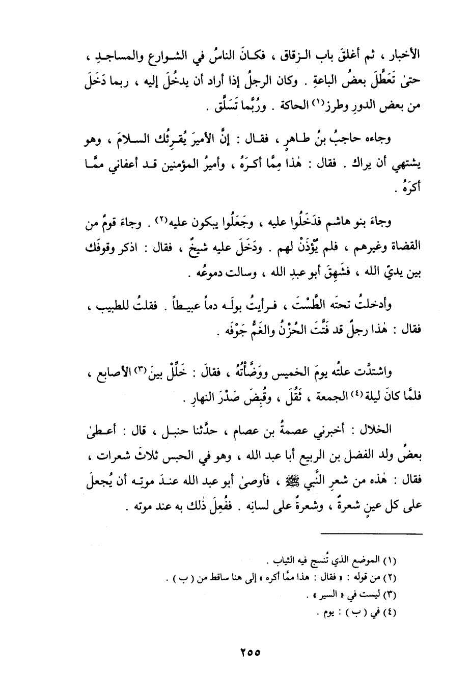 وجاء بنو هاشم فدخلوا عليه، وجَعَلُوا يبكون عليه (¬2). وجاء قومٌ من القضاة وغيرهم، فلم يُؤذَن لهم " ودخل عليه شيخ، فقال: اذكر وقوفك بين يديّ الله، فشَهِقَ أبو عبد الله، وسالت دموعُه.