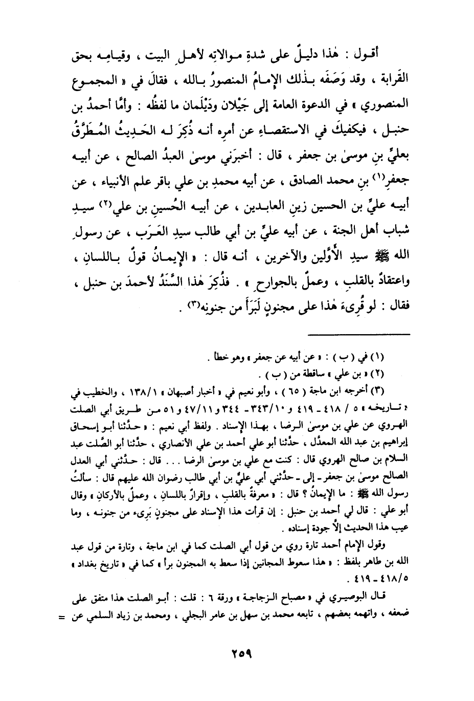 (¬3) أخرجه ابن ماجة (65)، وأبو نعيم في " أخبار أصبهان " 1/ 138، والخطيب في " تاريخه " 5/ 418 - 419 و10/ 343 - 344 و11/ 47 و51 من طريق أبي الصلت الهروي عن علي بن موسى الرضا، بهذا الإسناد. ولفظ أبي نعيم: " حدثنا أبو إسحاق إبراهيم بن عبد الله المعدَّل، حدثنا أبو علي أحمد بن علي الأنصاري، حدثنا أبو الصلت عبد السلام بن صالح الهروي قال: كنت مع علي بن موسى الرضا ... قال: حدثني أبي العدل الصالح موسى بن جعفر -إلى- حدثني أبي عليٌّ بن أبي طالب رضوان الله عليهم قال: سألت رسول الله - صلى الله عليه وسلم -: ما الإيمان؟ قال: " معرفةٌ بالقلب، وإقرارٌ باللسان، وعملٌ بالأركان " وقال أبو علي: قال لي أحمد بن حنبل: إن قرأت هذا الإسناد على مجنونٍ بَرِىء من جنونه، وما عيب هذا الحديث إلاَّ جودة إسناده.