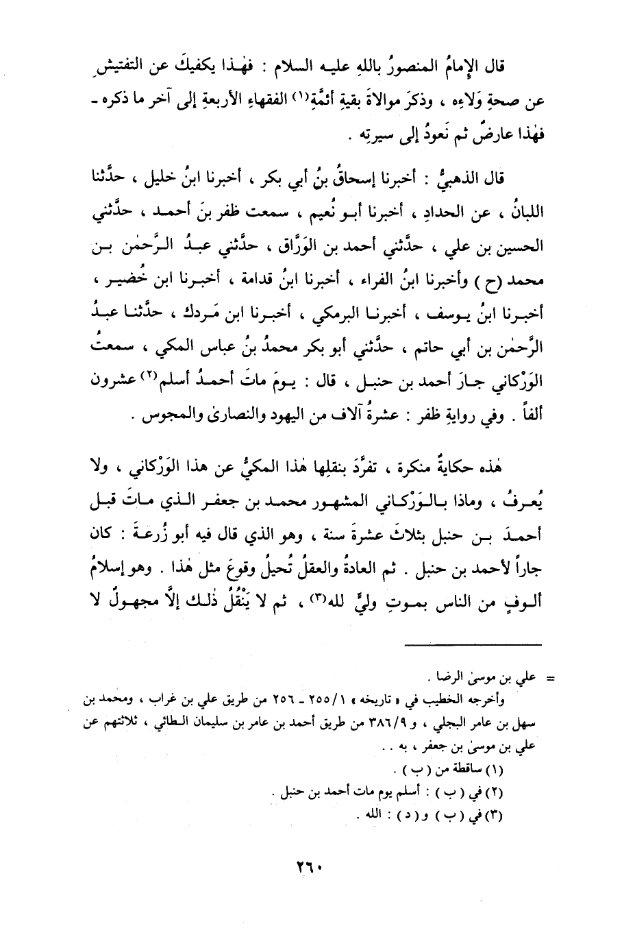 هذه حكاية منكرة، تفرَّد بنقلها هذا المكي عن هذا الوركاني، ولا يعرف، وماذا بالوركاني المشهور محمد بن جعفر الذي مات قبل أحمد بن حنبل بثلاث عشرة سنة، وهو الذي قال فيه أبو زرعة: كان جاراً لأحمد بن حنبل. ثم العادة والعقل تُحيلُ وقوع مثل هذا. وهو إسلام ألوفٍ من الناس بموت وليٍّ لله (¬3)، ثم لا ينقُلُ ذلك إلاَّ مجهولٌ لا