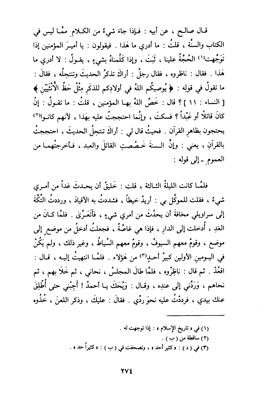 قال صالح، عن أبيه: فإذا جاء شيءٌ من الكلام ممَّا ليس في الكتاب والسنَّة، قلت: ما أدري ما هذا. فيقولون: يا أمير المؤمنين إذا توجهت (¬1) الحُجَّةُ علينا، ثبت، وإذا كلَّمناهُ بشيءٍ، يقول: لا أدري ما هذا. فقال: ناظروه، فقال رجلٌ: أراك تذكر الحديث وتنتحِلُه، فقال: ما تقول في قوله: {يُوصيكُم الله في أولادِكم للذكَرِ مثلُ حظِّ الأُنثَيَيْنِ} [النساء: 11]؟ قال: خصَّ الله بها المؤمنين، قلت: ما تقول: إن كان قاتلاً أو عبداً؟ فسكت، وإنما احتججتُ عليه بهذا، لأنهم كانوا (¬2) يحتجون بظاهرِ القرآن. فحيثُ قال لي: أراك تنتحل الحديث، احتججت بالقرآن، يعني: وإنَّ السنة خصَّصتِ القاتل والعبد، فأخرجتهما من العموم - إلى قوله: