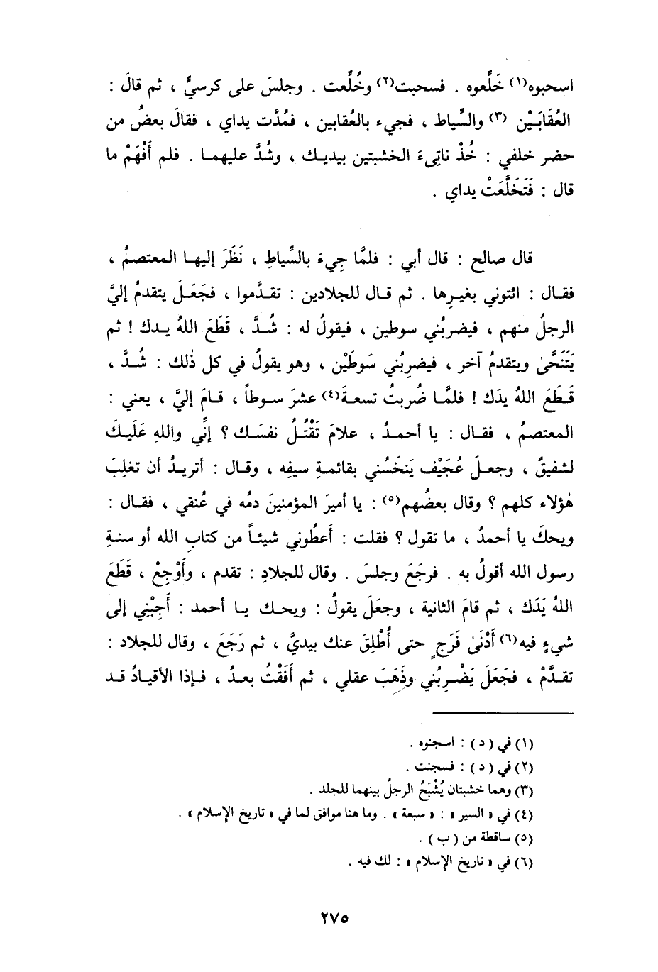قال صالح: قال أبي فلما جيء بالسياط، نظر إليها المعتصم، فقال: ائتوني بغيرها. ثم قال للجلادين: تقدَّموا، فجعل يتقدم إليَّ الرجل منهم، فيضربني سوطين، فيقول له: شُدَّ، قطع الله يدك! ثم يتنحَّى ويتقدم آخر، فيضرِبُني سوطين، وهو يقول في كل ذلك: شُدَّ، قطع الله يدَك! فلما ضُربتُ تسعة (¬4) عشر سوطاً، قام إليَّ، يعني: المعتصم، فقال: يا أحمد، علام تقتُلُ نفسك؟ إنِّي والله عليك لشفيقٌ، وجعل عُجَيْف ينخسُني بقائمة سيفه، وقال: أتريد أن تغلب هؤلاء كلهم؟ وقال بعضهم (¬5): يا أمير المؤمنين دمُه في عُنقي، فقال: ويحكَ يا أحمد، ما تقول؟ فقلت: أعطوني شيئاً من كتاب الله أو سنة رسول الله أقولُ به. فرجع وجلسَ. وقال للجلاد: تقدم، وأوجع، قَطَعَ الله يدك، ثم قام الثانية، وجعل يقول: ويحك يا أحمد: أجبني إلى شيءٍ فيه (¬6) أدنى فرجٍ حتى أُطلِقَ عنك بيديَّ، ثم رَجَعَ، وقال للجلاد: تقدَّم، فجعل يضرِبُني وذهب عقلي، ثم أفقتُ بعد، فإذا الأقياد قد