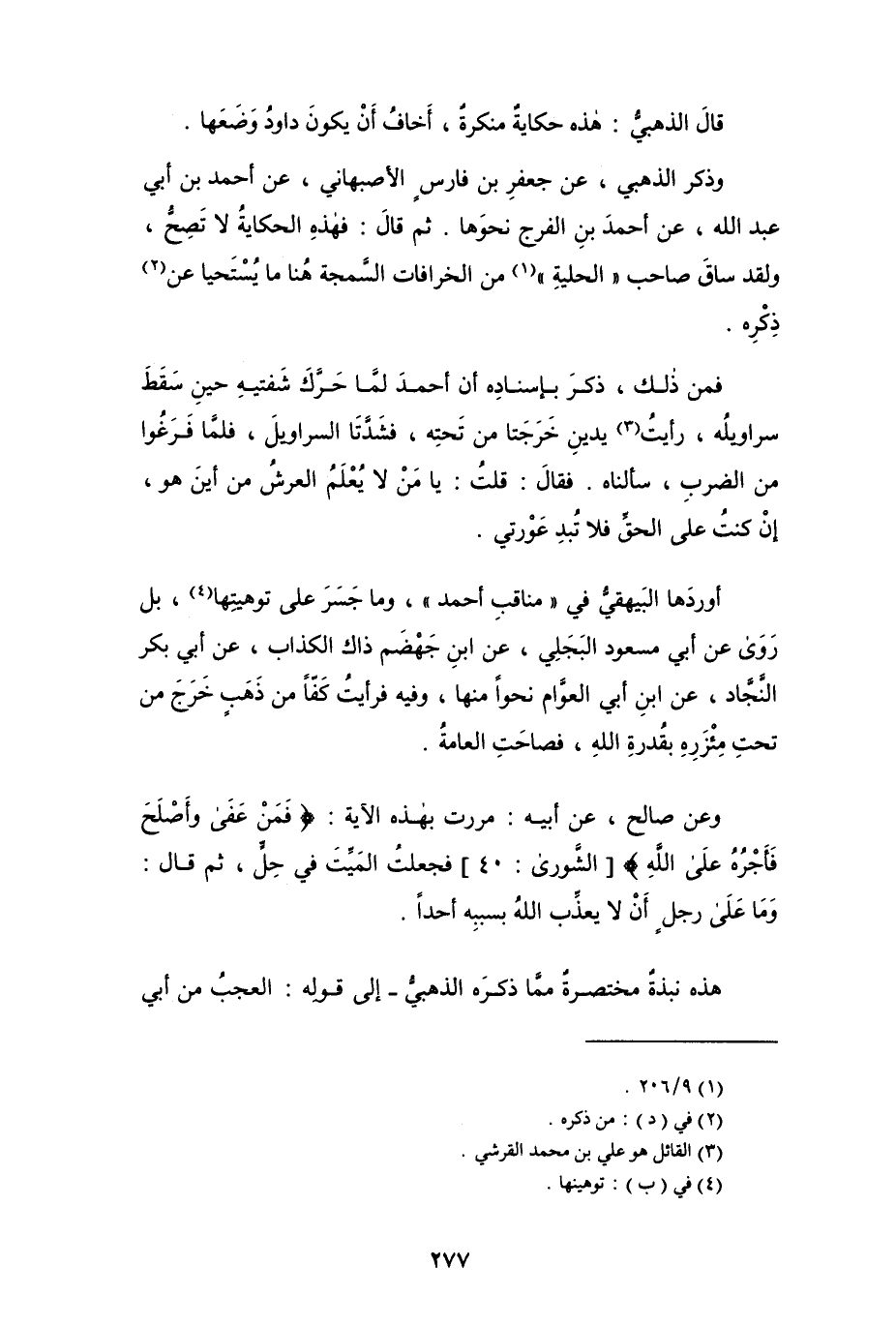 وذكر الذهبي، عن جعفر بن فارسٍ الأصبهاني، عن أحمد بن أبي عبد الله، عن أحمد بن الفرج نحوها. ثم قال: فهذه الحكايةُ لا تَصِحُّ، ولقد ساق صاحب " الحلية " (¬1) من الخرافات السَّمجة هنا ما يُستحيا عن (¬2) ذكره.