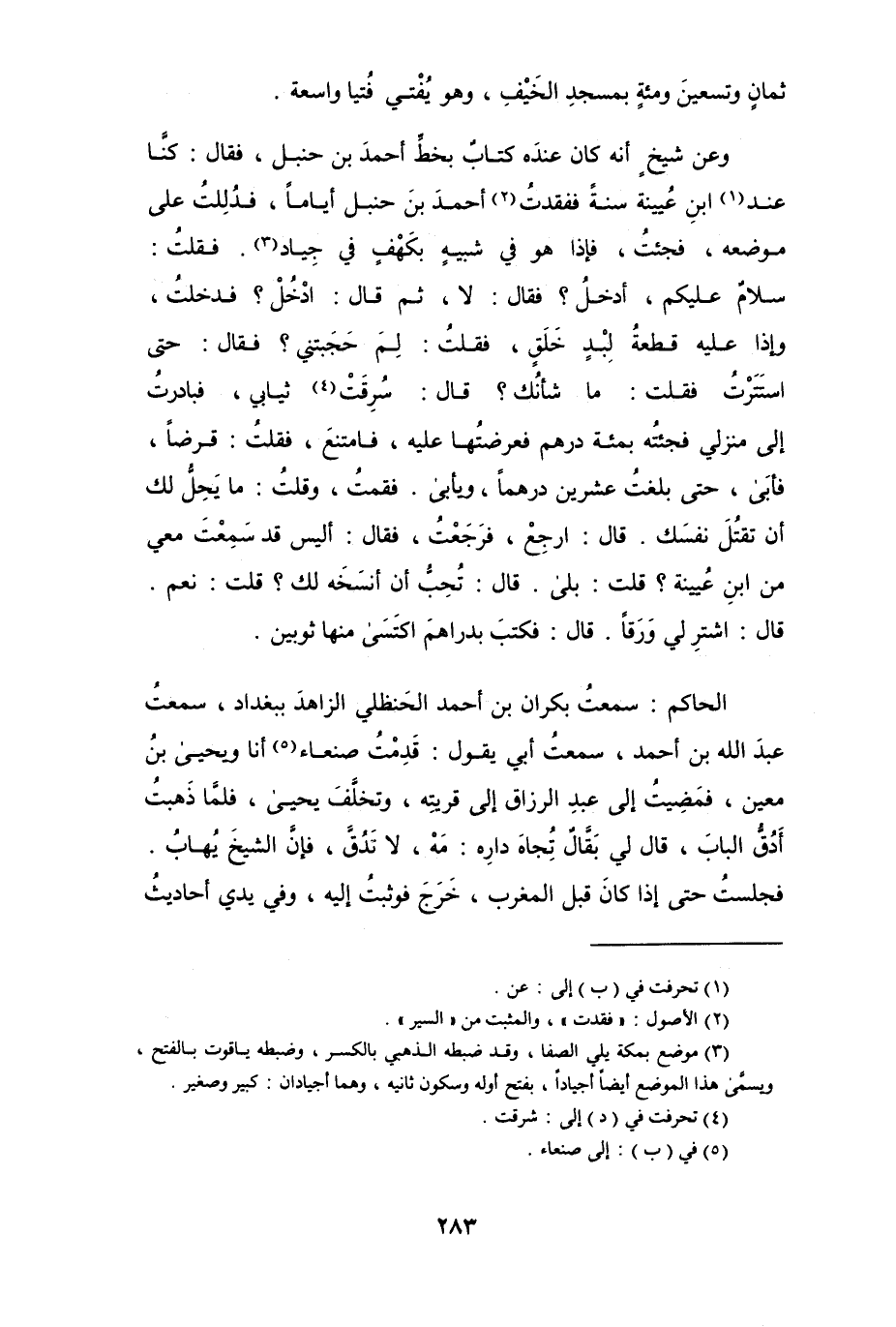 وعن شيخٍ أنه كان عنده كتابٌ بخطِّ أحمد بن حنبل، فقال: كنا عند (¬1) ابن عيينة سنة ففقدت (¬2) أحمد بن حنبل أياماً، فدُلِلتُ على موضعه، فجئت، فإذا هو في شبيهٍ بكهفٍ في جياد (¬3). فقلت: سلام عليكم، أدخلُ؟ فقال: لا، ثم قال: ادْخُلْ، فدخلت، وإذا عليه قطعة لبدٍ خلقٍ، فقلت: لِمَ حجبتني؟ فقال: حتى استترتُ فقلت: ما شأنك؟ قال: سُرقت (¬4) ثيابي، فبادرت إلى منزلي فجئته بمئة درهم فعرضتها عليه، فامتنع، فقلت: قرضاً، فأبى، حتى بلغتُ عشرين درهماً، ويأبى. فقمت، وقلت: ما يحِلُّ لك أن تقتل نفسك. قال: ارجع، فرجعت، فقال: أليس قد سمعت معي من ابن عُيينة؟ قلت: بلى. قال: تحبُّ أن أنسخه لك؟ قلت: نعم. قال: اشتر لي وَرَقاً. قال: فكتب بدراهم اكتسى منها ثوبين.