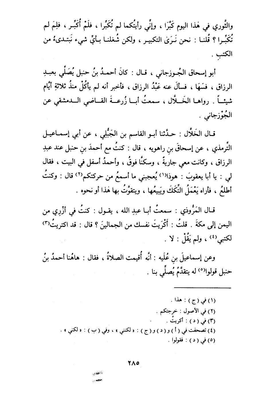أبو إسحاق الجُوزجاني، قال: كان أحمد بن حنبل يصلي بعبد الرزاق، فسها، فسأل عنه عبد الرزاق، فأخبر أنه لم يأكل منذ ثلاثة أيام شيئاً. رواها الخلال، سمعت أبا زرعة القاضي الدمشقي عن الجوزجاني.