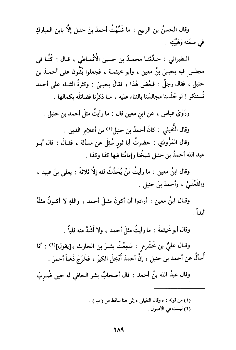 الطبراني: حدثنا محمد بن حسين الأنماطي، قال: كنا في مجلسٍ فيه يحيى بن معين، وأبو خيثمة، فجعلوا يُثْنُون على أحمد بن حنبل، فقال رجلٌ: فبعض هذا، فقال يحيى: وكثرةُ الثناء على أحمد تُستنكر! لو جلسنا مجالسنا بالثناء عليه، ما ذكرنا فضائله بكمالها.
