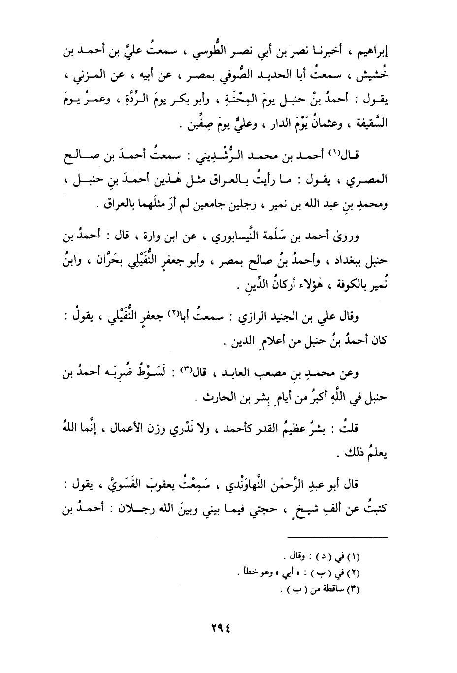 إبراهيم، أخبرنا نصر بن أبي نصر الطوسي، سمعت علي بن أحمد بن خُشيش، سمعت أبا الحديد الصُّوفي بمصر، عن أبيه، عن المزني، يقول: أحمد بن حنبل يوم المِحْنَةِ، وأبو بكر يوم الرِّدَّة، وعمر يوم السَّقيفة، وعثمان يوم الدار، وعليٌّ يوم صِفِّين.