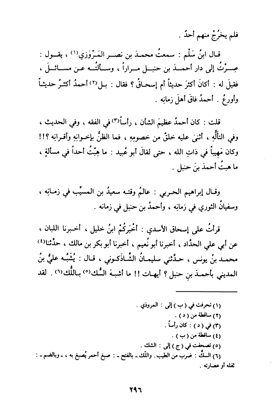 قال ابن سَلْم: سمعت محمد بن نصر المروزي (¬1)، يقول: صِرتُ إلى دار أحمد بن حنبل مراراً، وسألته عن مسائل، فقيل له: أكان أكثر حديثاً أم إسحاق؟ فقال: بل (¬2) أحمد أكثر حديثاً وأورع. أحمد فاق أهل زمانه.