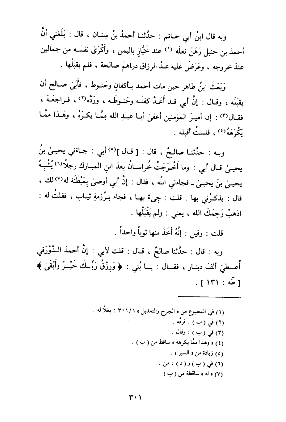 وبه قال ابن أبي حاتم: حدثنا أحمد بن سنان، قال: بَلَغني أن أحمد بن حنبل رَهَنَ نعلَه (¬1) عند خَبَّازٍ باليمن، وأكرى نفسه من جمالين عند خروجه، وعَرَضَ عليه عبدُ الرزاق دراهم صالحة، فلم يقبَلُها.