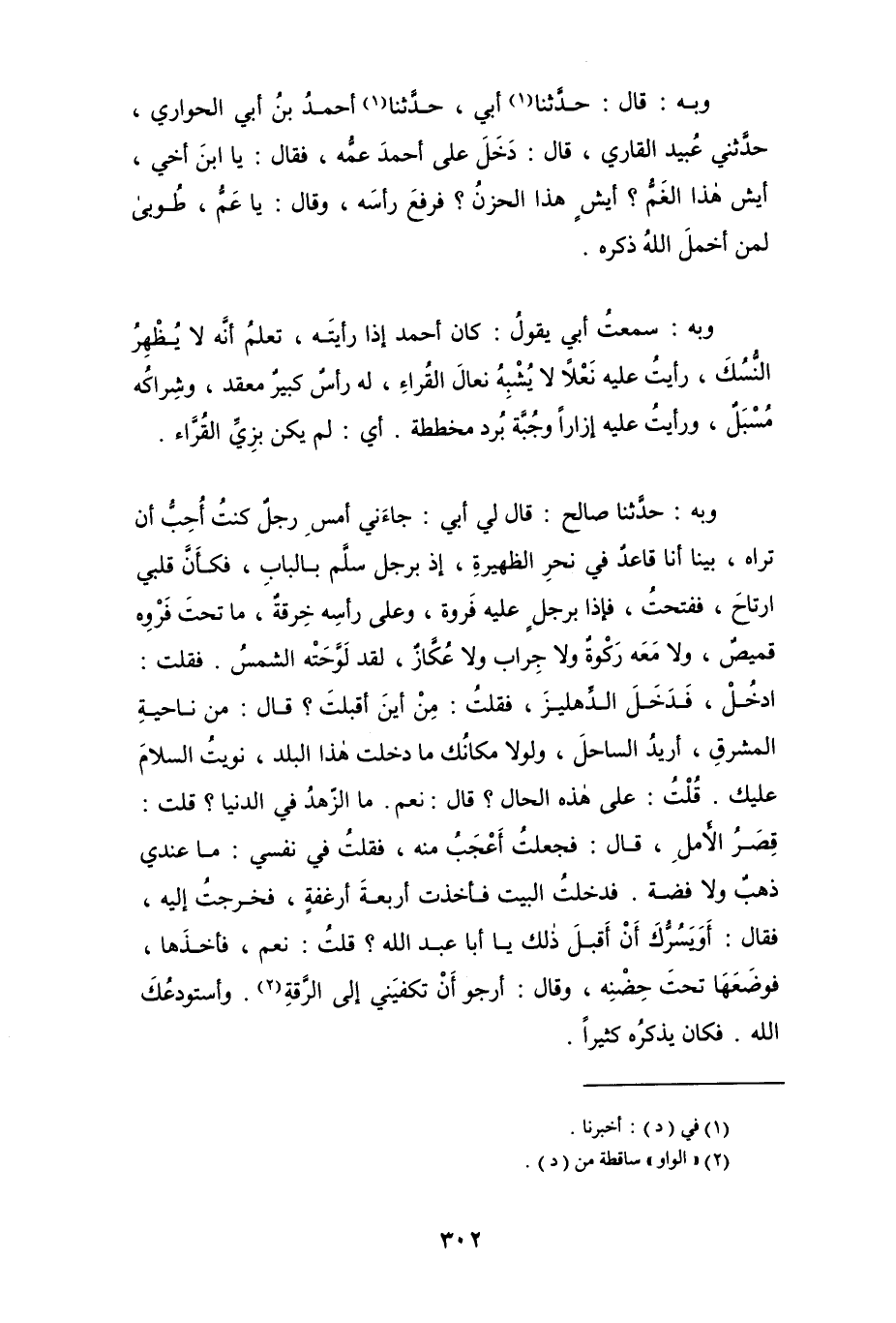 وبه: حدثنا صالح: قال لي أبي: جاءني أمسِ رجلٌ كنت أُحِبُّ أن تراه، بينا أنا قاعدٌ في نحرِ الظهيرة، إذ برجل سلَّم بالباب، فكأنَّ قلبي ارتاح، ففتحتُ، فإذا برجلٍ عليه فَروة، وعلى رأسه خِرقةُ، ما تحت فروه قميصٌ، ولا مَعَه رَكْوةٌ ولا جِراب ولا عُكَّازٌ، لقد لَوَّحته الشمسُ. فقلت: ادخُلْ، فَدَخَلَ الدهليز، فقلت: مِنْ أين أقبلت؟ قال: من ناحية المشرق، أريد الساحل، ولولا مكانك ما دخلت هذا البلد، نويتُ السلام عليك. قُلتُ: على هذه الحال؟ قال: نعم. ما الزهد في الدنيا؟ قلت: قصر الأمل، قال: فجعلت أعجب منه، فقلت في نفسي: ما عندي ذهبٌ ولا فضة. فدخلت البيت فأخذت أربعة أرغفةٍ، فخرجت إليه، فقال: أوَيَسُرُّك أن أقبل ذلك يا أبا عبد الله؟ قلت: نعم، فأخذها، فوضعها تحت حِضنه، وقال: أرجو أن تكفيني إلى الرقة (¬2). وأستودعك الله. فكان يذكره كثيراً.