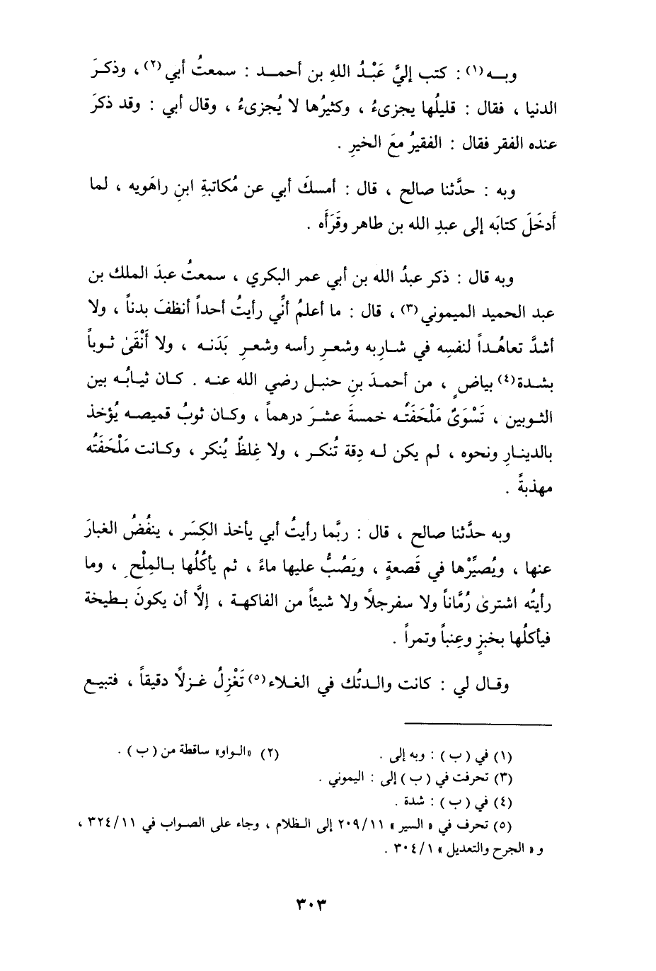 وبه حدثنا صالح، قال: ربَّما رأيت أبي يأخذ الكِسر، ينفض الغبار عنها، ويصيَّرها في قَصعةٍ، ويصُبُّ عليها ماءً، ثم يأكلها بالمِلحِ، وما رأيته اشترى رُمَّانًا ولا سفرجلاً ولا شيئاً من الفاكهة، إلاَّ أن يكون بطيخة فيأكلها بخبزٍ وعِنباً وتمراً.
