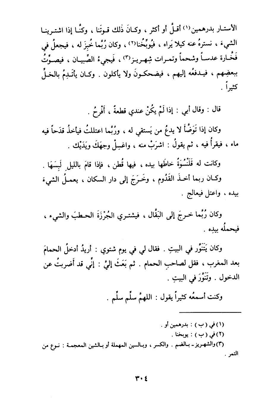 وكان يتنوَّر في البيت. فقال لي في يوم شتوي: أريدُ أدخلُ الحمامَ بعد المغرب، فقل لصاحب الحمام. ثم بعث إليَّ: إني قد أضربتُ عن الدخول. وتنوَّر في البيت.