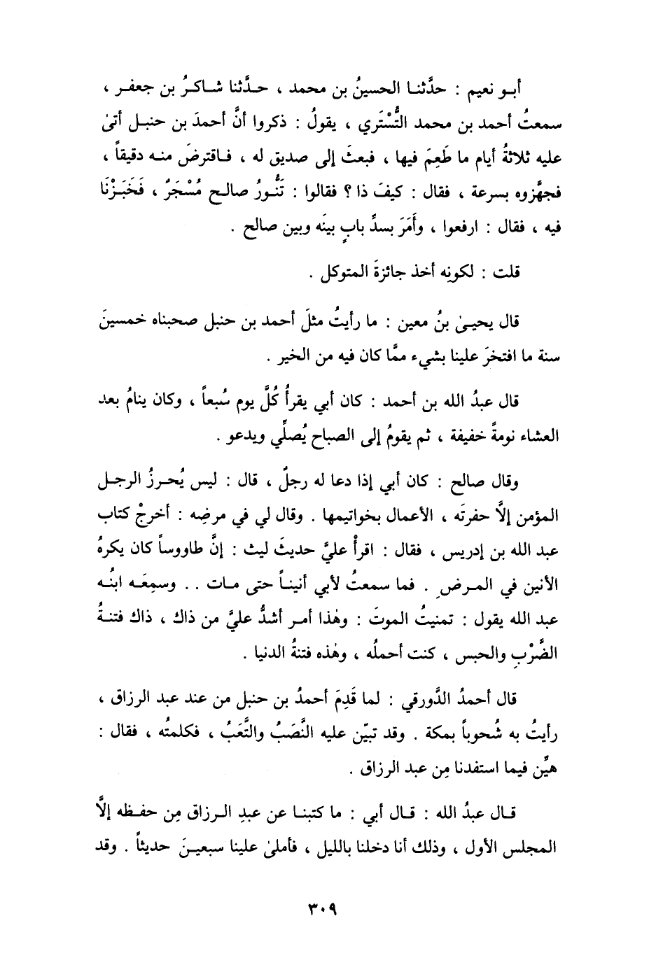 وقال صالح: كان أبي إذا دعا له رجلٌ، قال: ليس يحرز الرجل المؤمن إلاَّ حفرته، الأعمال بخواتيمها. وقال لي في مرضه: أخرج كتاب عبد الله بن إدريس، فقال: اقرأ عليَّ حديث ليث: إنَّ طاووساً كان يكره الأنين في المرض. فما سمعتَ لأبي أنيناً حتى مات .. وسمِعَه ابنه عبد الله يقول: تمنيت الموت: وهذا أمر أشدُّ عليَّ من ذاك، ذاك فتنةُ الضرب والحبس، كنت أحملُه، وهذه فتنةُ الدنيا.