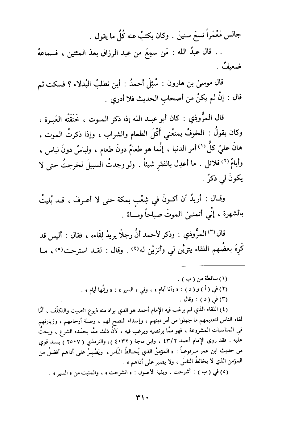 (¬4) اللقاء الذي لم يركب فيه الإمام أحمد هو الذي يراد منه ذيوع الصيت والتكلف، أمَّا لقاء الناس لتعليمهم ما جهلوا من أمر دينهم، وإسداء النصح لهم، وصلة أرحامهم، وزيارتهم في المناسبات المشروعة، فهو ممَّا يرتضيه ويرغب فيه، لأن ذلك ممَّا يحمده الشرع، ويحثُّ عليه. فقد روى الإمام أحمد 2/ 43، وابن ماجة (4032)، والترمذي (2507) بسند قوي من حديث ابن عمر مرفوعاً: " المؤمن الذي يُخالطُ الناس، ويصبر على أذاهم أفضل من المؤمن الذي لا يخالطُ الناس، ولا يصبر على أذاهم ".