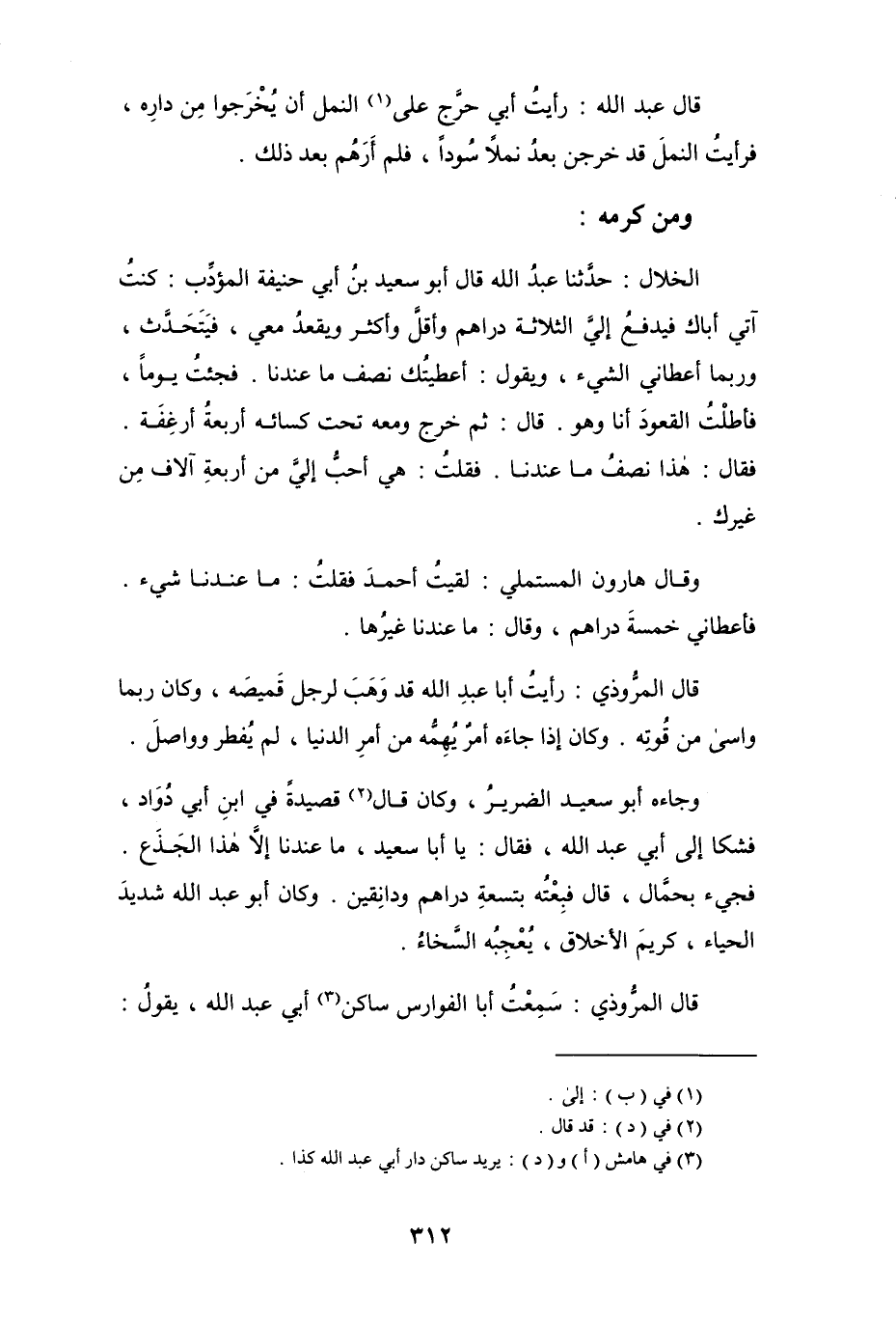 قال عبد الله: رأيت أبي حرَّج على (¬1) النمل أن يُخْرَجوا من داره، فرأيت النمل قد خرجن بعدُ نملاً سُوداً، فلم أرهم بعد ذلك.