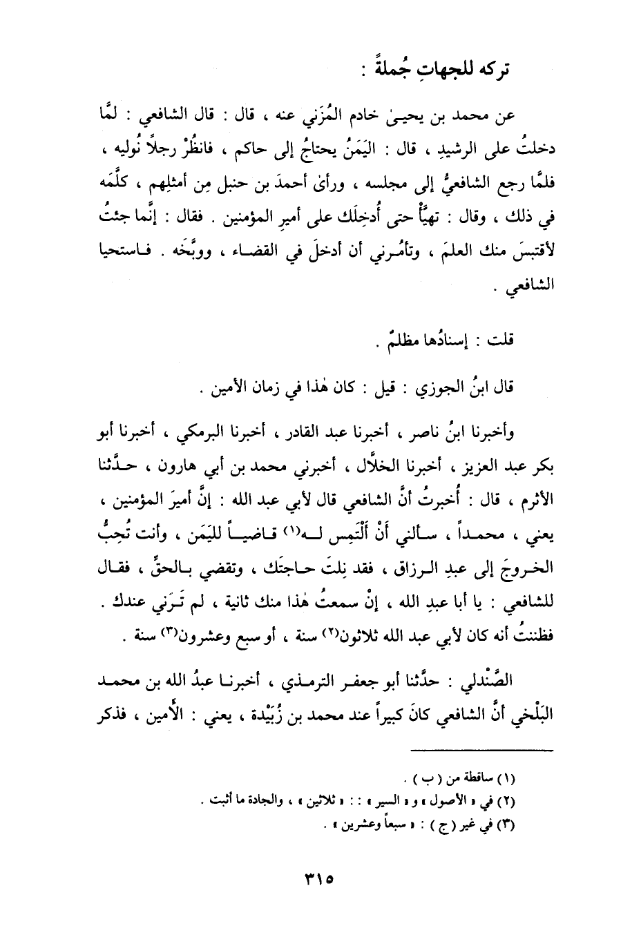 الصَّنْدلي: حدثنا أبو جعفر الترمذي، أخبرنا عبد الله بن محمد البلخي أن الشافعي كان كبيراً عند محمد بن زُبَيْدة، يعني: الأمين، فذكر
