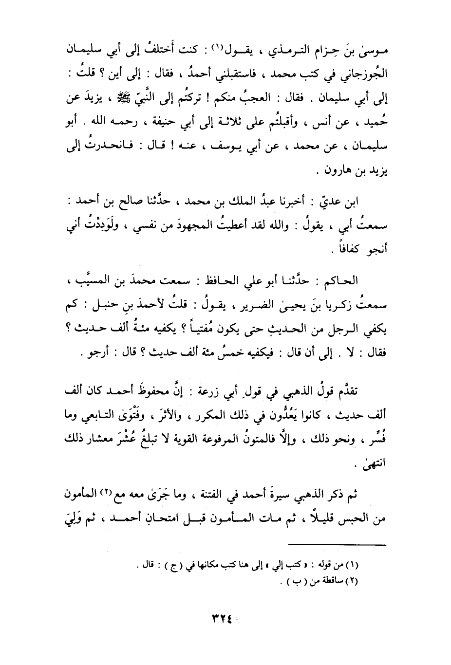 موسى بن حِزام الترمذي، يقول (¬1): كنت أختلفُ إلى أبي سليمان الجوزجاني في كتب محمد، فاستقبلني أحمد، فقال: إلى أين؟ قلت: إلى أبي سليمان. فقال: العجبُ منكم! تركتُم إلى النبي - صلى الله عليه وسلم -، يزيد عن حُميد، عن أنس، وأقبلتم على ثلاثة إلى أبي حنيفة، رحمه الله. أبو سليمان، عن محمد، عن أبي يوسف، عنه! قال: فانحدرت إلى يزيد بن هارون.