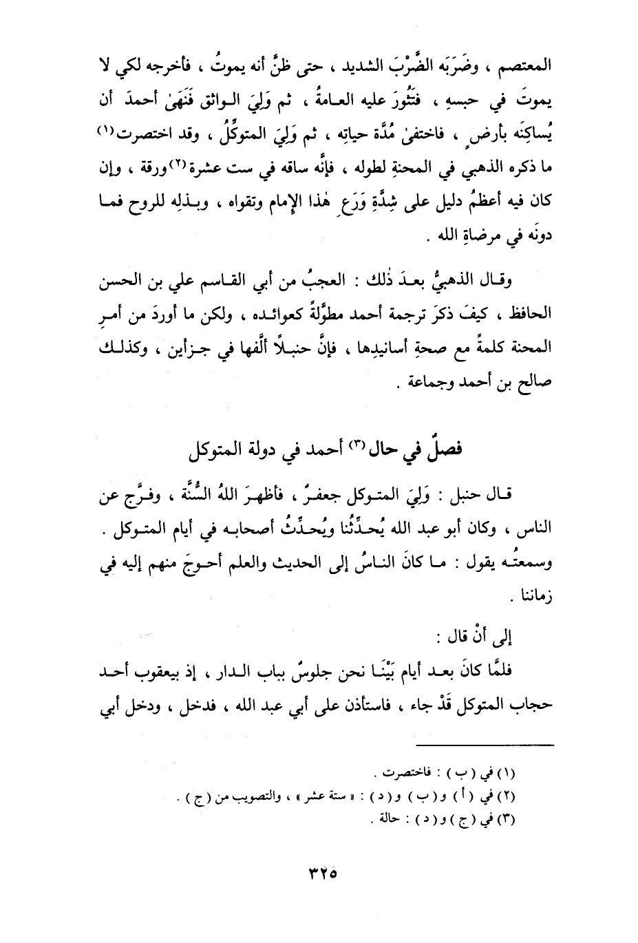 المعتصم، وضَرَبَه الضرب الشديد، حتى ظنَّ أنه يموت، فأخرجه لكي لا يموت في حبسه، فتثُور عليه العامة، ثم وَلِيَ الواثق فَنَهَى أحمد أن يُساكِنَه بأرضٍ، فاختفي مُدَّة حياته، ثم وَلِيَ المتوكِّلُ، وقد اختصرت (¬1) ما ذكره الذهبي في المحنةِ لطوله، فإنَّه ساقه في ست عشرة (¬2) ورقة، وإن كان فيه أعظمُ دليل على شِدَّةِ وَرَعِ هذا الإمام وتقواه، وبذله للروح فما دونه في مرضاةِ الله.