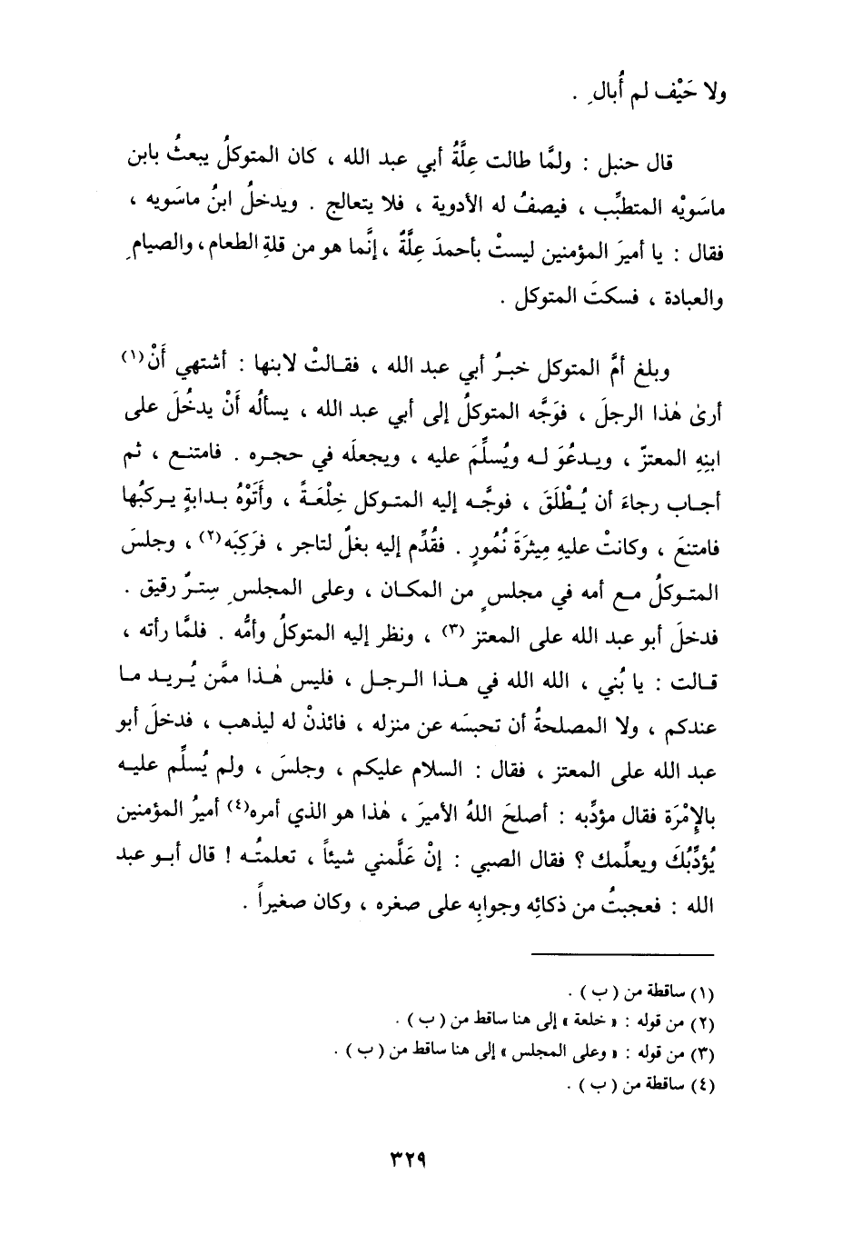 فدخل أبو عبد الله على المعتز (¬3)، ونظر إليه المتوكل وأمه. فلما رأته، قالت: يا بني، الله الله في هذا الرجل، فليس هذا ممن يريد ما عندكم، ولا المصلحة أن تحبسه عن منزله، فائذنْ له ليذهب، فدخل أبو عبد الله على المعتز، فقال: السلام عليكم، وجلس، ولم يسلم عليه بالإمْرَة ققال مؤدِّبه: أصلح الله الأمير، هذا هو الذي أمره (¬4) أمير المؤمنين يُؤدِّبُك ويعلِّمك؟ فقال الصبي: إن علمني شيئاً، تعلمتُه! قال أبو عبد الله: فعجبت من ذكائه وجوابه على صغره، وكان صغيراً.