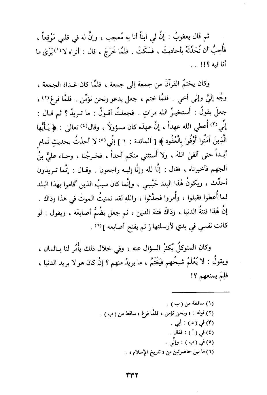 وكان يختم القرآن من جمعة إلى جمعة، فلمَّا كان غداة الجمعة، وجَّه إليَّ وإلى أخي. فلمَّا ختم، جعل يدعو ونحن نؤمِّن. فلما فرغ (¬2)، جعل يقول: أستخير الله مراتٍ. فجعلت أقول: ما تريدُ؟ ثم قال: إني (¬3) أُعطي الله عهداً، إن عهده كان مسؤولاً، وقال (¬4) تعالى: {يَا أَيُّهَا الَّذِينَ آمَنُوا أَوْفُوا بِالْعُقُودِ} [المائدة: 1] إني (¬5) لا أحدِّث بحديثٍ تمامٍ أبداً حتى ألقى الله، ولا أستثني منكم أحداً، فخرجنا، وجاء عليُّ بن الجهم فأخبرناه، فقال: إنا لله وإنا إليه راجعون. وقال: إنما تريدون أحدِّث، ويكون هذا البلد حبسي، وإنما كان سبب الذين أقاموا بهذا البلد لما أُعطوا فقبلوا، وأُمروا فحدَّثوا، والله لقد تمنيتُ الموت في هذا وذاك.