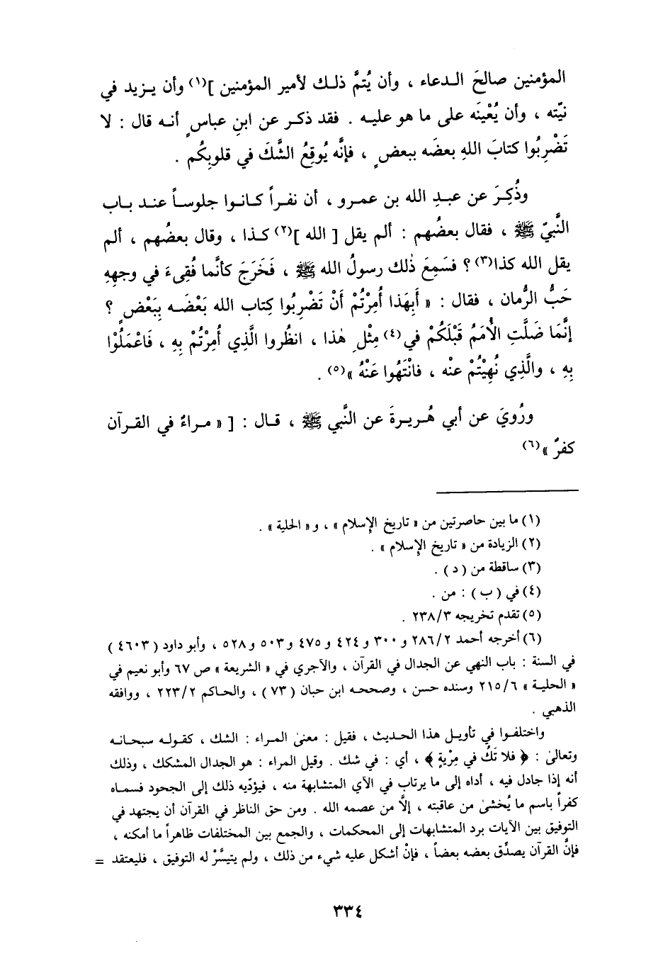 (¬6) أخرجه أحمد 2/ 286 و300 و424 و475 و503 و528، وأبو داود (4603) في السنة: باب النهي عن الجدال في القرآن، والآجري في " الشريعة " ص 67 وأبو نعيم في " الحلية " 6/ 215 وسنده حسن، وصححه ابن حبان (73)، والحاكم 2/ 223، ووافقه الذهبي.