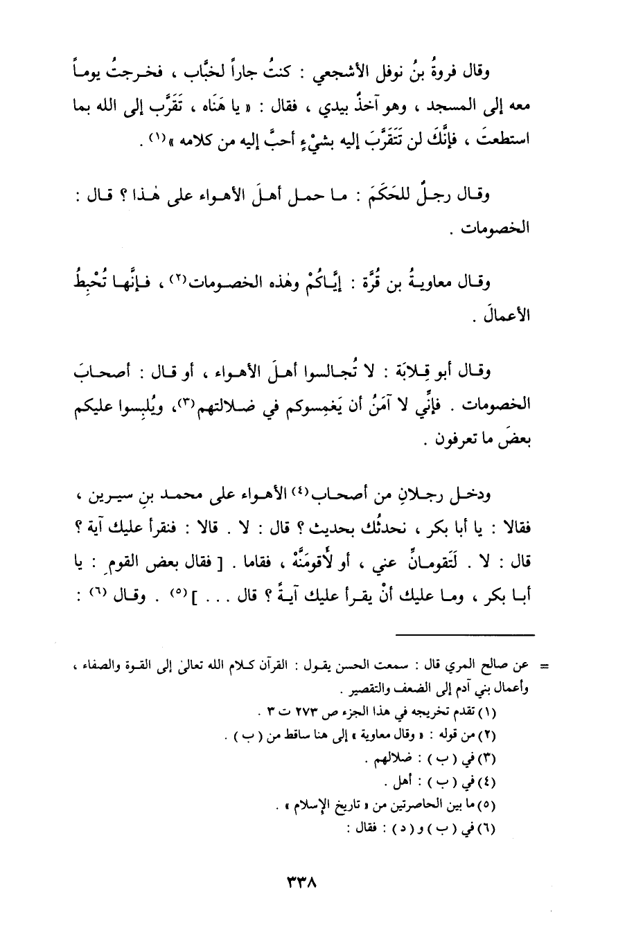 = عن صالح المري قال: سمعت الحسن يقول: القرآن كلام الله تعالى إلى القوة والصفاء، وأعمال بني آدم إلى الضعف والتقصير.