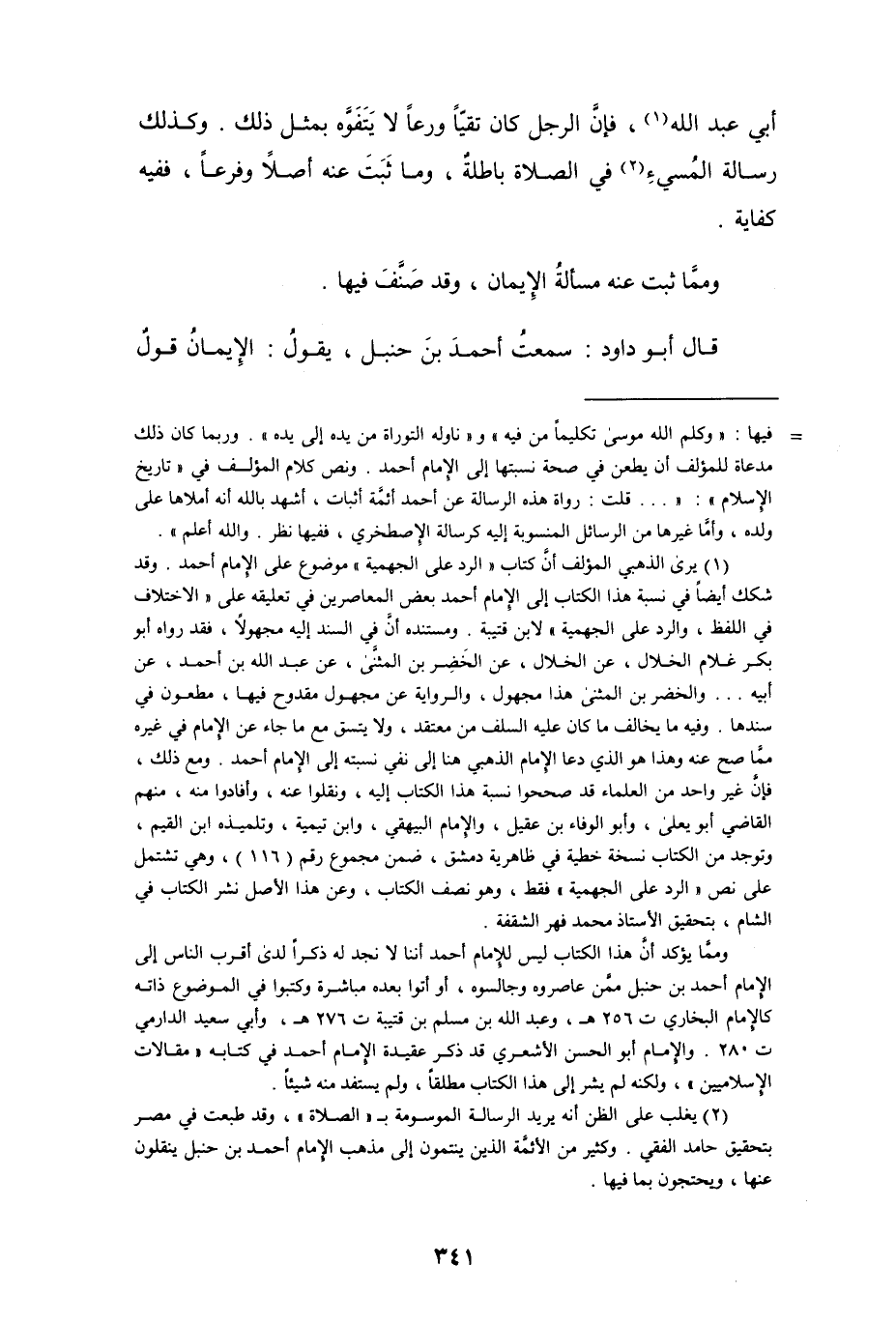 أبي عبد الله (¬1)، فإن الرجل كان تقياً ورعاً لا يَتَفَوَّه بمثل ذلك. وكذلك رسالة المُسيء (¬2) في الصلاة باطلةٌ، وما ثَبَتَ عنه أصلاً وفرعاً، ففيه كفاية.