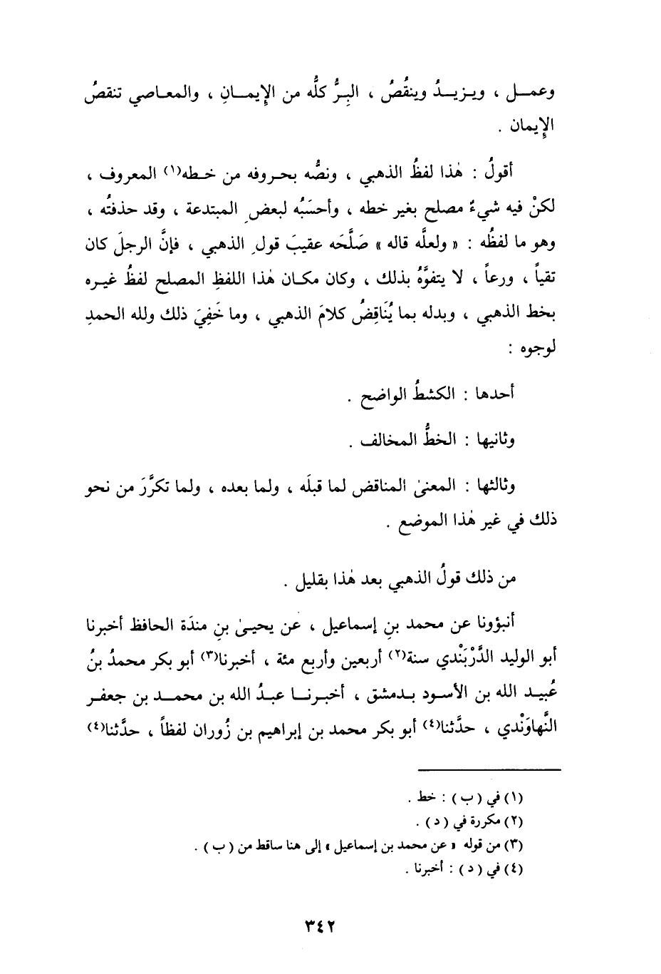 أقول: هذا لفظُ الذهبي، ونصه بحروفه من خطه (¬1) المعروف، لكن فيه شيء مصلح بغير خطه، وأحسبُه لبعض المبتدعة، وقد حذفتُه، وهو ما لفظه: " ولعله قاله " صلَّحه عقيب قول الذهبي، فإن الرجل كان تقياً، ورعاً، لا يتفوَّهُ بذلك، وكان مكان هذا اللفظ المصلح لفظ غيره بخط الذهبي، وبدله بما يناقض كلام الذهبي، وما خَفِيَ ذلك ولله الحمد لوجوه: