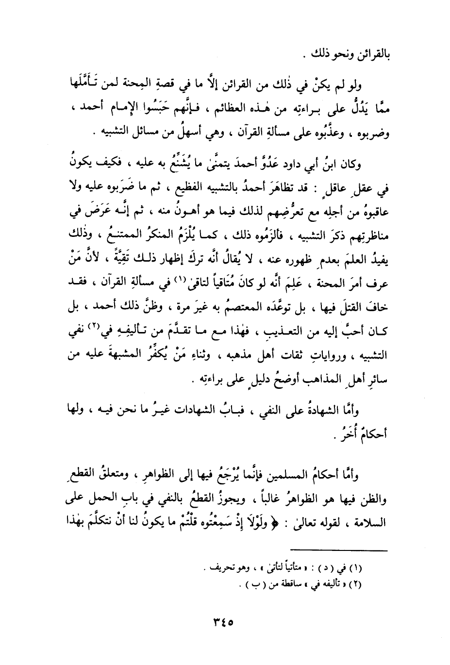 وكان ابن أبي داود عَدُوَّ أحمد يتمنى ما يُشَنِّعُ به عليه، فكيف يكون في عقل عاقل: قد تظاهر أحمد بالتشبيه الفظيع، ثم ما ضربوه عليه ولا عاقبوه من أجله مع تعرُّضِهم لذلك فيما هو أهونُ منه، ثم إنه عَرَضَ في مناظرتهم ذكر التشبيه، فألزموه ذلك، كما يُلزَمُ المنكرُ الممتنع، وذلك يفيدُ العلمَ بعدم ظهوره عنه، لا يُقالُ أنه ترك إظهار ذلك تَقِيَّةً، لأن من عرف أمرَ المحنة، عَلِمَ أنه لو كان مُتَاقياً لتاقى (¬1) في مسألة القرآن، فقد خاف القتل فيها، بل توعَّده المعتصم به غير مرة، وظن ذلك أحمد، بل كان أحبَّ إليه من التعذيب، فهذا مع ما تقدَّم من تأليفه في (¬2) نفي التشبيه، وروايات ثقات أهل مذهبه، وثناءِ من يُكفِّرُ المشبهة عليه من سائر أهل المذاهب أوضح دليل على براءته.