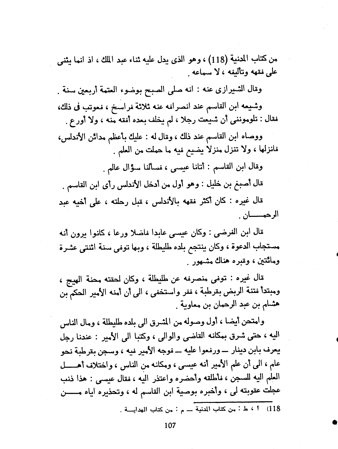 من كتاب الهدية. وهو الذي يدل عليه ثناء عبد الملك، إذ إنما بنى على فقهه، وبالغه لأسماعه. وقال الشيرازي عنه: إنه صلى الصبح بوضوء العتمة أربعين سنة. وسمعه ابن القاسم عند انصرافه عنه، بثلاثة فراسخ فعوتب على ذلك. فقال: يلومونني أن سمعت رجلاً لم يخلف بعده أفقه منه، ولا أورع ووصاه ابن القاسم عند ذلك. وقال له: عليك بأعظم مدائن الأندلس، فأنزلها. ولا تنزل منزلاً يضيع فيه ما حملت من العلم. وقال ابن القاسم: أتانا عيسى، فسألنا سؤال عالم. قال أصبغ بن خليل: وهو أول من أدخل الأندلس رأي ابن القاسم. قال غيره: وكان أكبر الفقهاء بالأندلس، قبل رحلته على أخيه عبد الرحمن. قال ابن الفرضي: وكان عيسى عابداً فاضلاً ورعاً. كانوا يرون أنه مستجاب الدعوة. وكان يبلغ بلده طليطلة بها توفي سنة اثنتي عشرة ومائتين، وقبره هناك مشهور. وقال غيره: توفي منصرفه عن طليطلة، وكان لحقته محنة الهيج ومبتدأ فتنة الربض بقرطبة. ففر واستخفى، الى أن أمنه الأمير الحكم بن هشام بن عبد الرحمن بن معاوية. وامتحن أيضاً أول وصوله من الشرق الى بلده طليطلة بميل الناس إليه حتى شرف مكانه القاضي والوالي. وكتب الى الأمير عنده رجل يعرف بابن دينار ورفعوا علي. فوجه الأمير الحكم فيه، وسجن بقرطبة نحو عام، الى أن علم الأمير به، أنه عيسى، ومكانه من الناس باختلاف أهل العلم للسجن، فأطلقه وأحضره واعتذر إليه. فقال عيسى: هذا ذنب عجلت عقوبته لي، وأخبره بوصية ابن القاسم له ونهيه إياه عن
