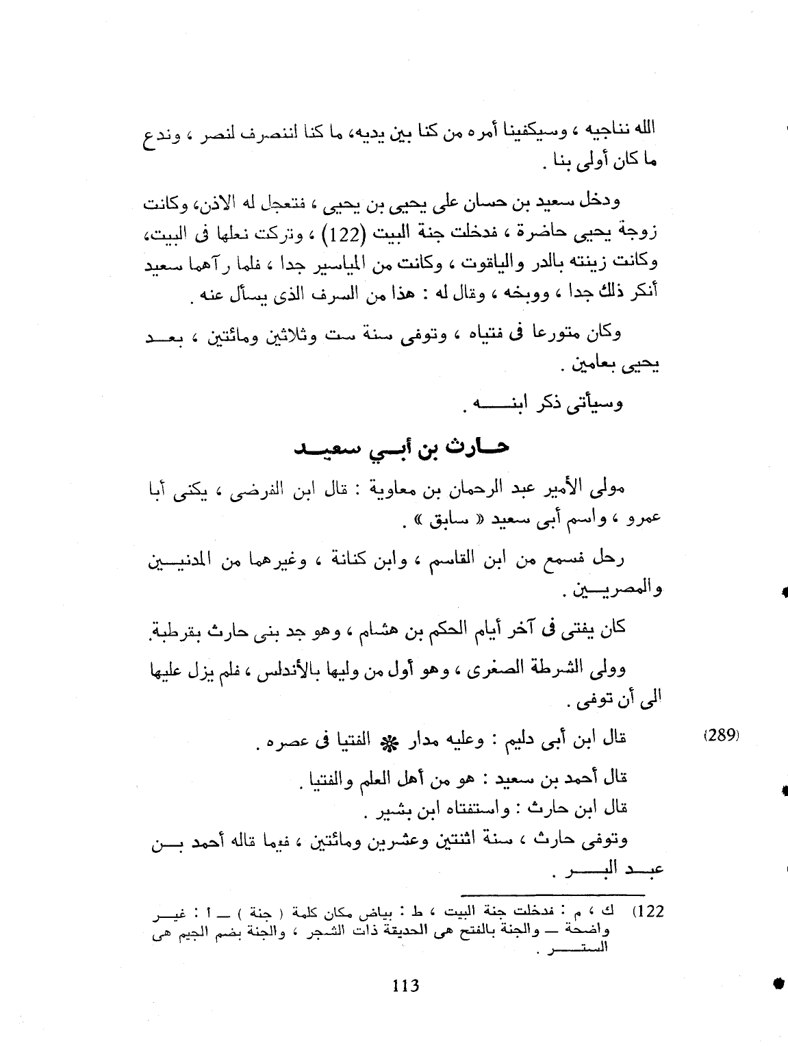 الله نناجيه. وسيكفينا أمره من كنا بين يديه. ما كنا لننصرف لنصر، وندع ما كان أولى منا. ودخل سعيد بن حسان على يحيى بن يحيى، فتعجل له الإذن، وكانت زوجة يحيى حاضرة. فدخلت جنبة البيت، وتركت نعلها في البيت، وكان مفصصة بالدر والياقوت. كانت من المياسير فلما رآهما سعيد أنكر ذلك جداً. ووبخه، وقال له: هذا من السرف الذي يسأل عنه. وكان متورعاً في فتياه. توفي سنة ست وثلاثين بعد يحيى بعامين وسيأتي ذكر ابنه إن شاء الله.