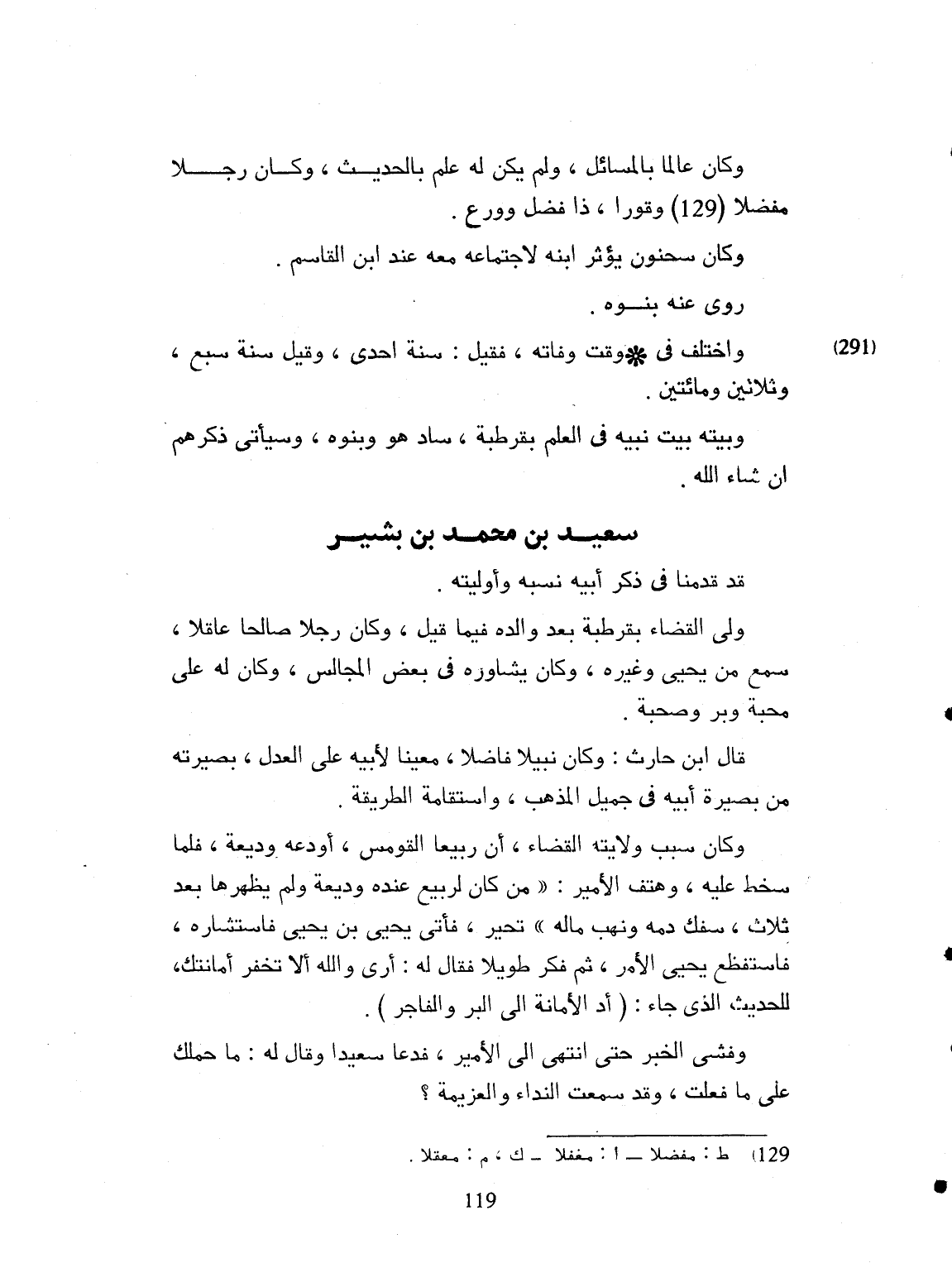وكان عالماً بالمسائل، ولم يكن عنده علم بالحديث، وكان رجلاً معضلاً وقوراً. ذا فضل وورع. وكان سحنون يؤثر ابنه لاجتماعه معه عند ابن القاسم. روى عنه بنوه، واختلف في وقت وفاته. فقيل سنة إحدى، وقيل سنة سبع وثلاثين ومائتين، وبيته بيت فقه في العلم بقرطبة. ساد هو وبنوه، وسيأتي ذكرهم إن شاء الله تعالى.