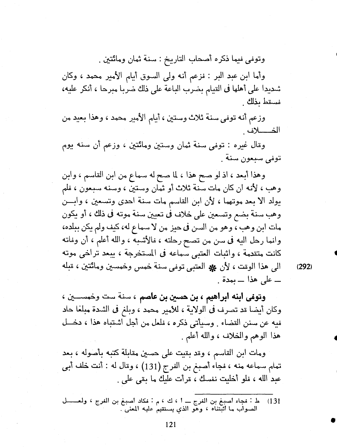 وتوفي فيما ذكر أصحاب التاريخ: سنة ثمان ومائتين. وأما ابن عبد البر فزعم أنه ولي السوق أيام الأمير محمد. وكان شديداً على أهلها، في القيم. فضرب الباعة على ذلك ضرباً مبرحاً. أنكر عليه، فسقط بذلك. وزعم أنه توفي سنة ثلاث وستين أيام الأمير محمد، وهذا بعيد من الخلاف، وقال غيره: توفي سنة ثمان ومائتين. وزعم أن سنه يوم توفي سبعون سنة. وهذا أبعد، إذ لو صح هذا، لما صح له سماع من ابن القاسم وابن وهب، لأنه إن كان مات سنة إحدى وتسعين وابن وهب سنة بضع وتسعين، على خلاف في تعيين سنة موته في ذلك، أو يكون موت ابن وهب وهو في السن في حيز من الإسماع له. كيف ولم يكن ببلده وإنما هو رحل إليه في سن من يصح رحلته، بالأشبه، والله أعلم أن وفاته متقدمة وإثبات العتبي سماعه في المستخرجة يبعد تراخي موته، الى هذا الوقت. لأن العتبي توفي سنة خمس وخمسين ومائتين، قبله على هذا بمدة. وتوفي ابنه ابراهيم بن حسين بن عاصم سنة ست وخمسين. وكان أيضاً قد تصرف في الولاية سنين للأمير محمد وبلغ في الشدة مبلغاً حاد فيه عن سنن القضاء. وسيأتي ذكره. فلعل من اشتباه هذا دخل هذا الوهم، والخلاف والله أعلم. ومات ابن القاسم وقد بقيت على حسين مقابلة كتبه بأصوله، بعد تمام سماعه منه. فكاد أصبغ بن الفرج وقال له: أنت خلف أبي عبد الله. فلو خليت نفسك، قرأت عليك ما بقي علي.