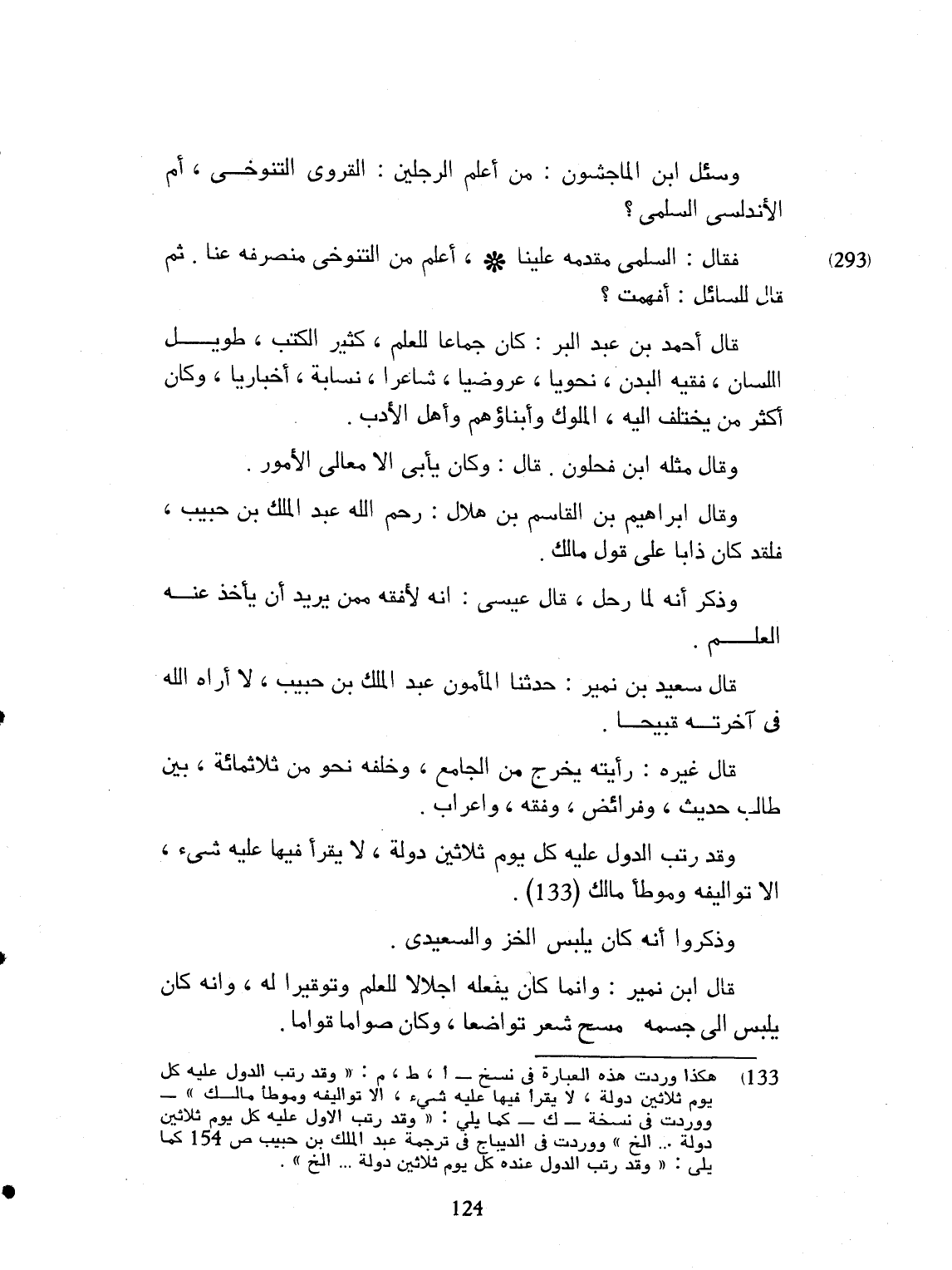 وسئل ابن الماجشون من أعلم الرجلين. القروي التنوخي، أم الأندلسي السلمي " فقال: السلمي مقدمه علينا، أعلم أن التنوخي منصرفه عنا. ثم قال للسائل: أفهمت؟ قال أحمد بن عبد البر: كان جمّاعاً للعلم، كثير الكتب، طويل اللسان، فقيه البدن، نحوياً عروضياً شاعراً، نسابة إخبارياً. وكان أكثر من يختلف إليه الملوك وأبناؤهم من أهل الأدب. وقال نحوه ابن غلبون قال وكان يأبى إلا معالي الأمور. وقال ابراهيم بن قاسم بن هلال رحمه الله: عبد الملك بن حبيب: فلقد كان ذاباً عن قول مالك. وذكر أنه لما رحل قال عيسى: إنه لأفقه ممن يريد أن يأخذ عنه العلم. وقال سعيد بن نمير: حدثنا المأمون عبد الملك بن حبيب. لا أراه الله في إخوته قبحاً. قال غيره: رأيته يخرج من الجامع وخلفه نحو من ثلاثمائة من طالب حديث وفرائض وفقه، واعراب. وقد رتب الدول عليه كل يوم ثلاثين دولة؟ لا لا يقرأ عليه فيها شيء إلا تأليف وموطأ مالك. وذكر أنه يلبس الخز والسعيدي. قال ابن عبيد: وإنما كان يفعله إجلالاً للعلم، وتوقيره. وإنه كان يلبس الى جسمه مسح شعر، تواضعاً. وكان صواماً قواماً.